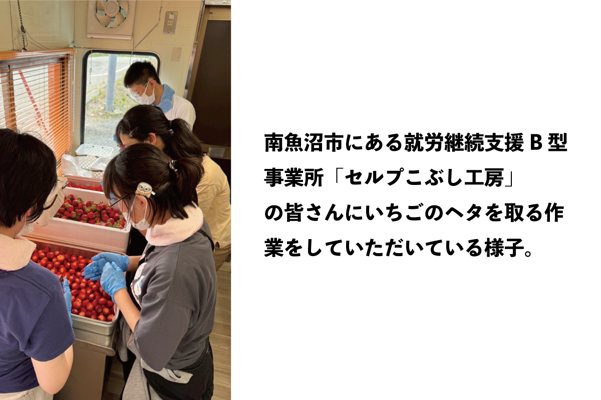 本プロジェクトでは、南魚沼市にある就労継続支援B型事業所「セルプこぶし工房」の皆さんに袋詰めなどの作業をお手伝いいただいています 福祉と農業が手を取り合うことで、地域にあたたかな雇用とやりがいが生まれています。いちご1粒1粒に込められた、たくさんの“想い”も一緒に感じてください