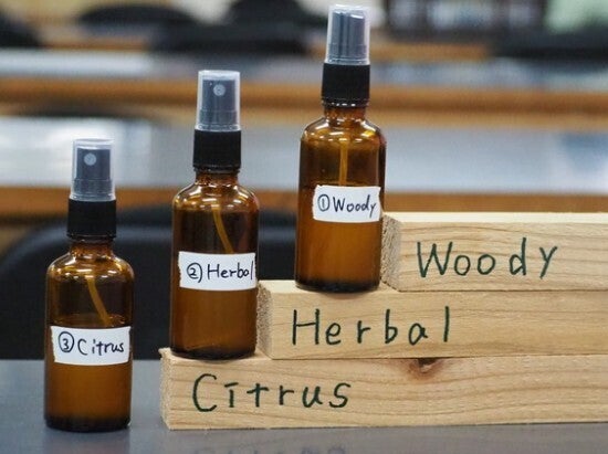 +伊達市産の桃の種の蒸留液上記レシピを基本に、「ウッディ系」「シトラス系」「ハーバル系」という3種のアロマオイルを準備しており、最終的に1種を選定します。