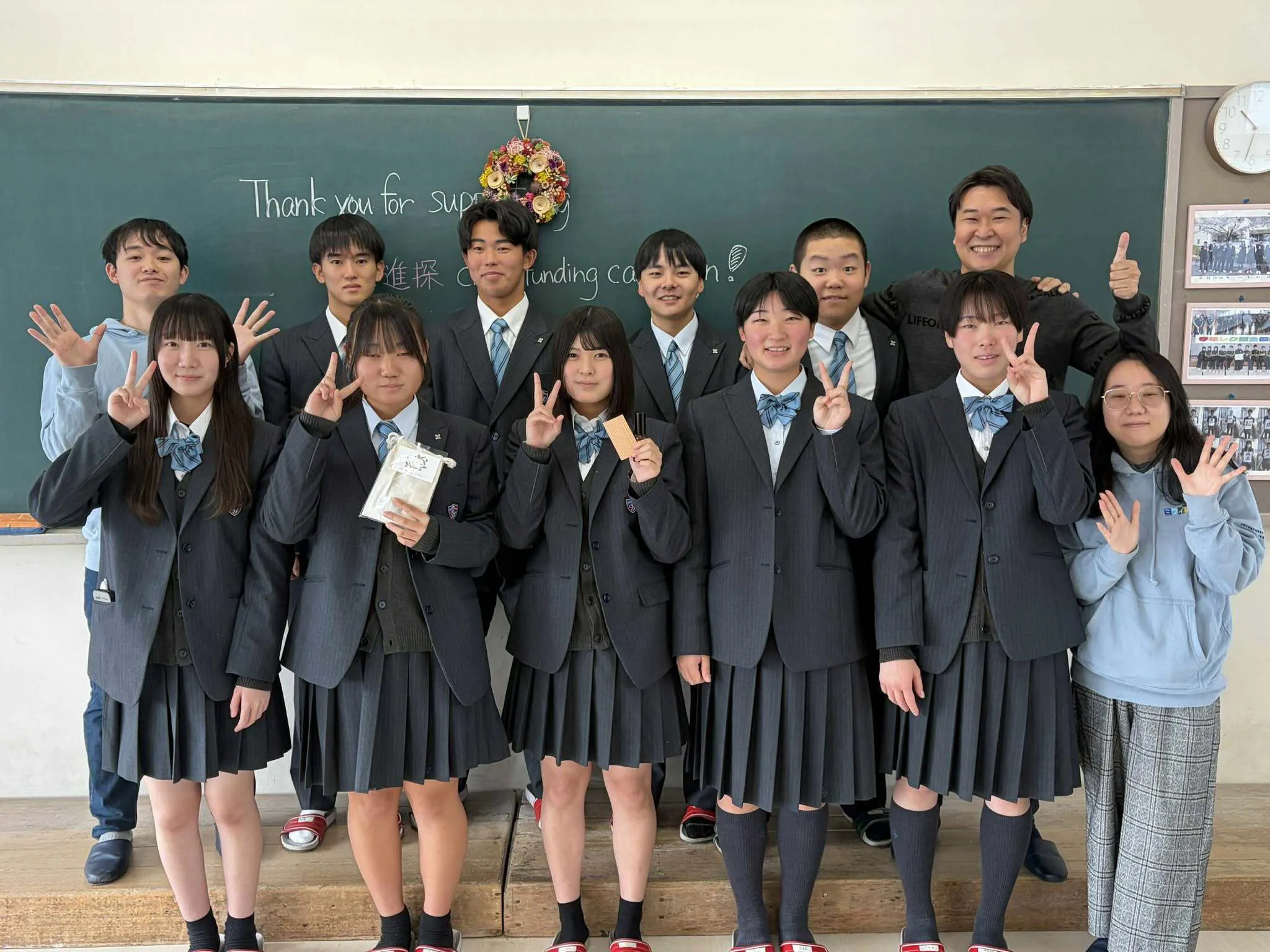 2025/12/16 10:26このたびは、福島の高校生たちが挑戦したクラウドファンディングにご支援をいただき、誠にありがとうございました。おかげさまで 24名の方から合計24万円ものご支援を頂戴することができました。心より感謝申し上げます。12月9日(火)の授業では、生徒たち全員でお礼のメッセージや動画づくりに取り組みました。感謝の気持ちをぎゅっと込めて作成しましたので、お礼のメッセージでご支援された方は、到着までもう少々楽しみにお待ちください。リターン品に必要な商品も順調にそろってきています。いただいたご支援にしっかりお応えできるよう、1月末の授業で準備と発送作業を進め、順次お届けしていく予定です。今回のご支援は、生徒たちにとって大きな励みとなり、挑戦する力や学びの実感につながりました。本当にありがとうございました。今後とも温かく見守っていただけましたら幸いです。 もっと見る