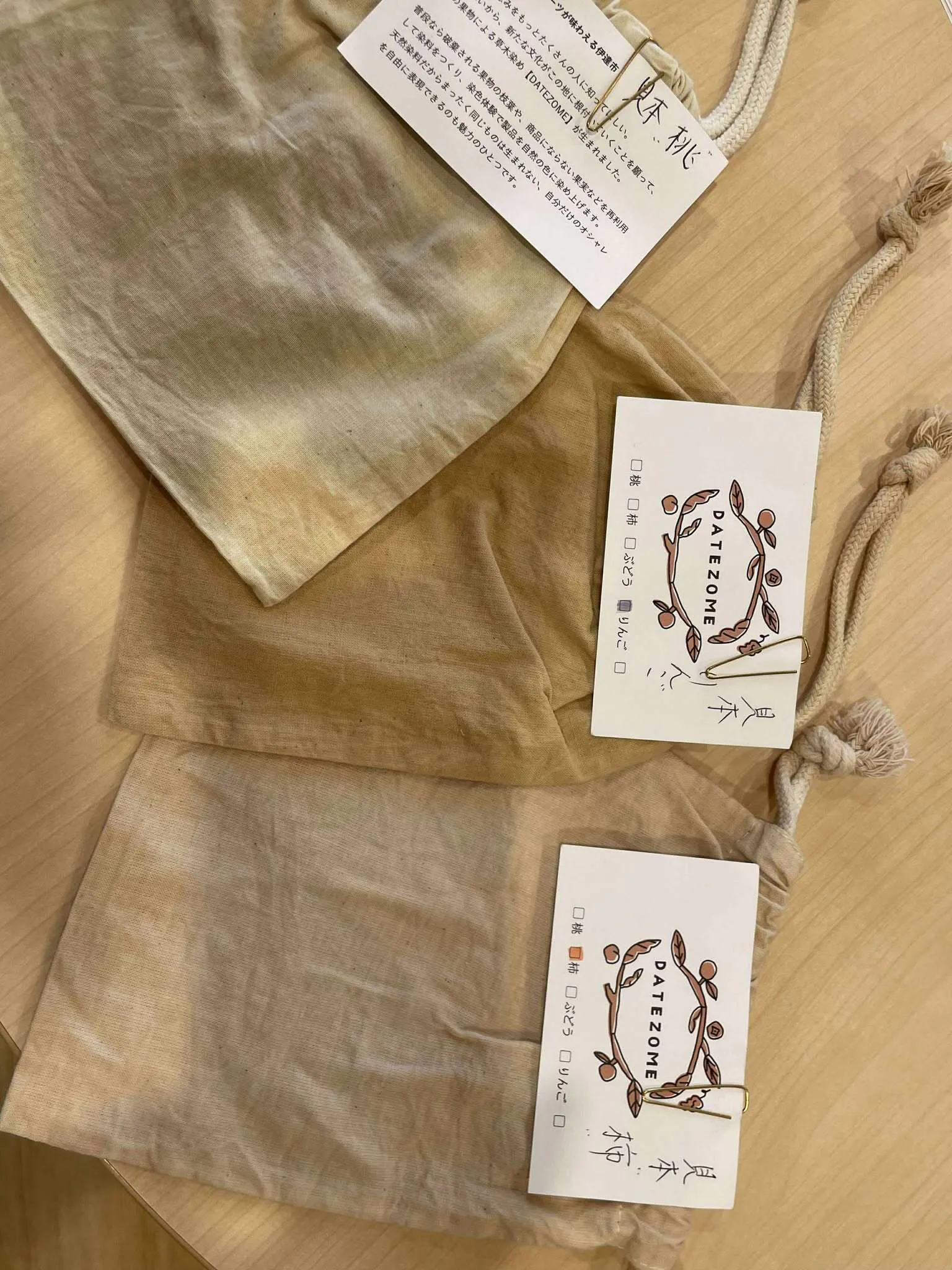 今回はきんちゃく袋に(18cm×15cm)とご自宅で草木染ができる「伊達染キット」としてお届けいたします。