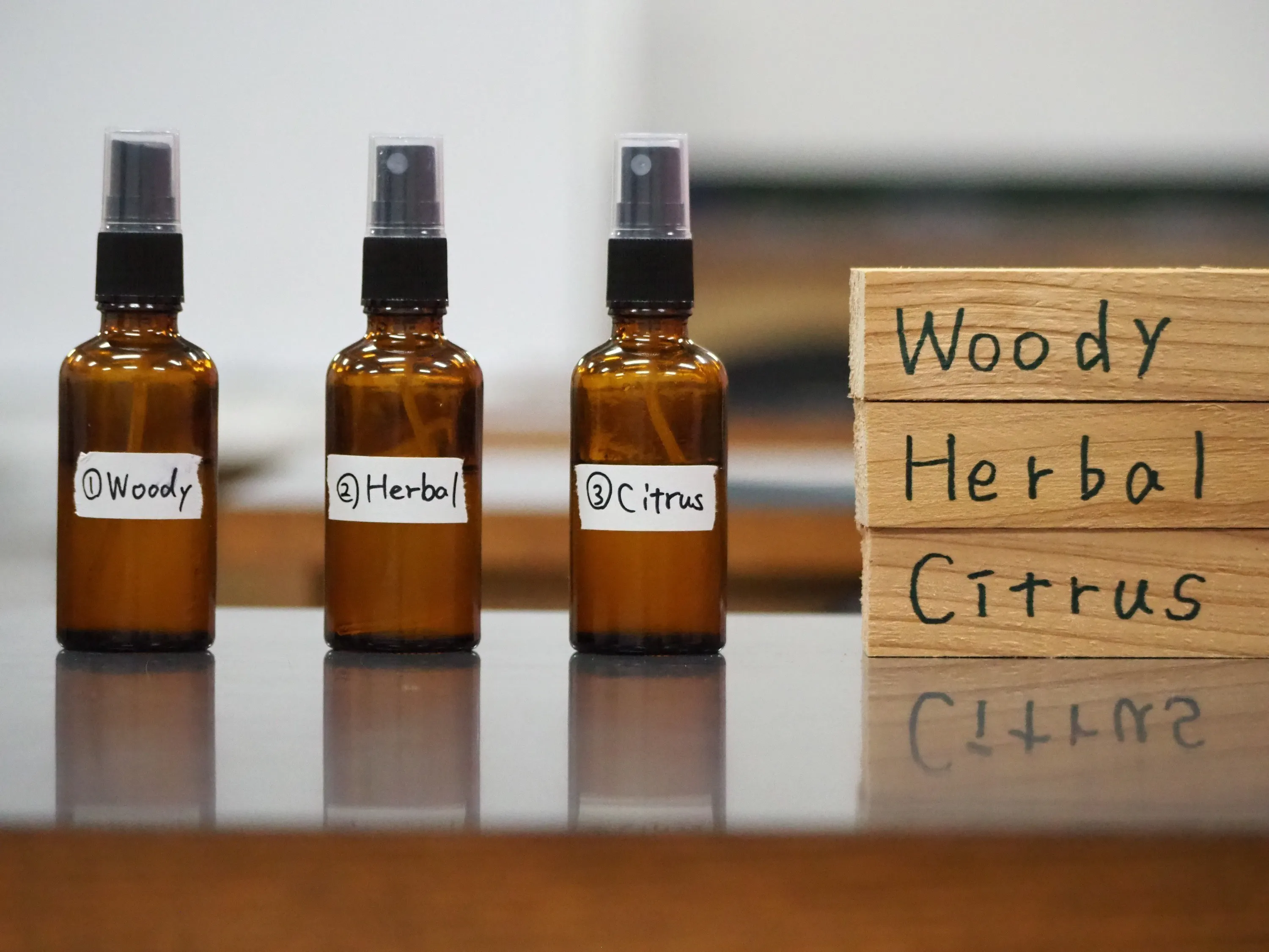 +伊達市産の桃の種の蒸留液上記レシピを基本に、「ウッディ系」「シトラス系」「ハーバル系」という3種のアロマオイルを準備しており、最終的に1種を選定します。