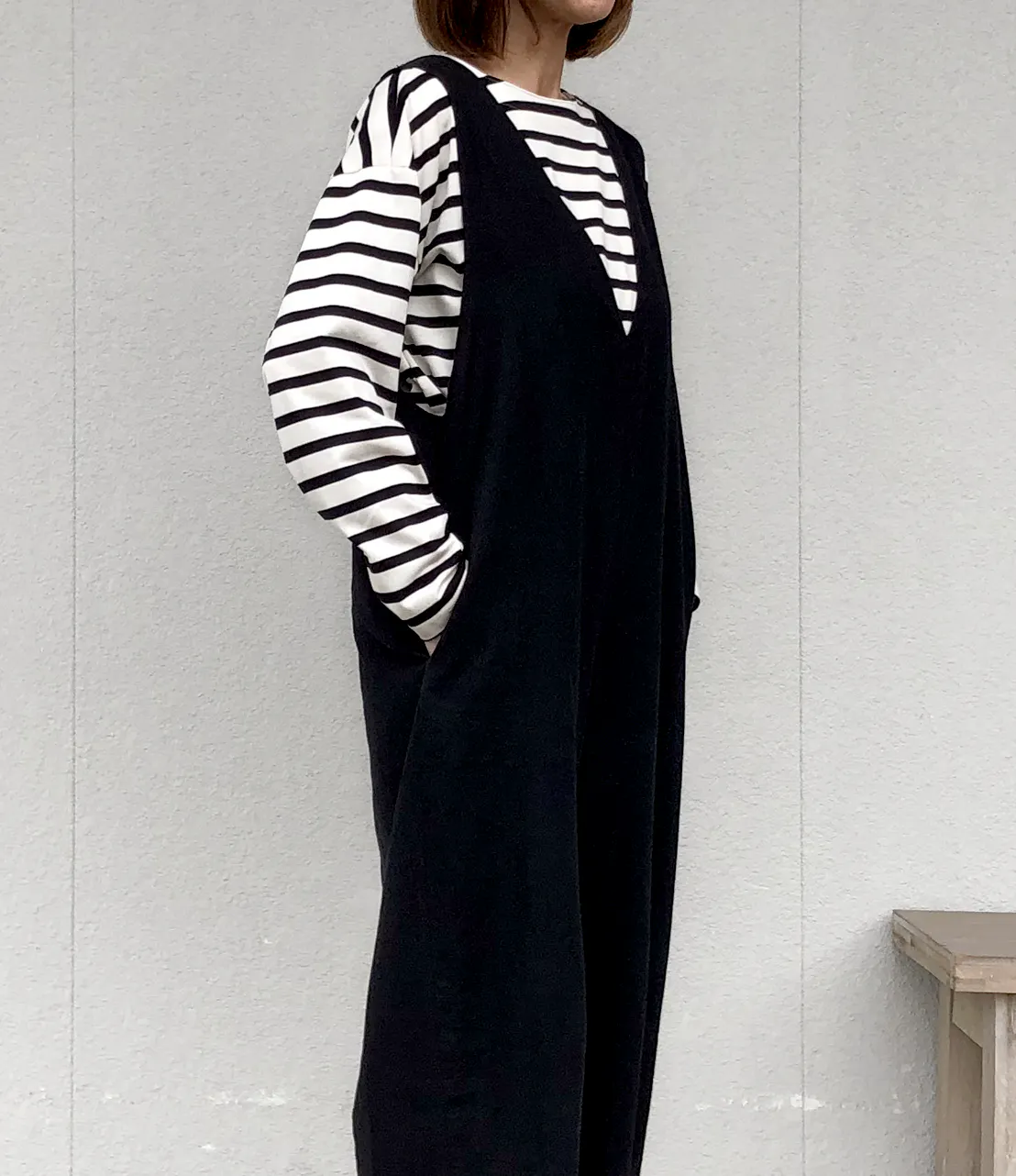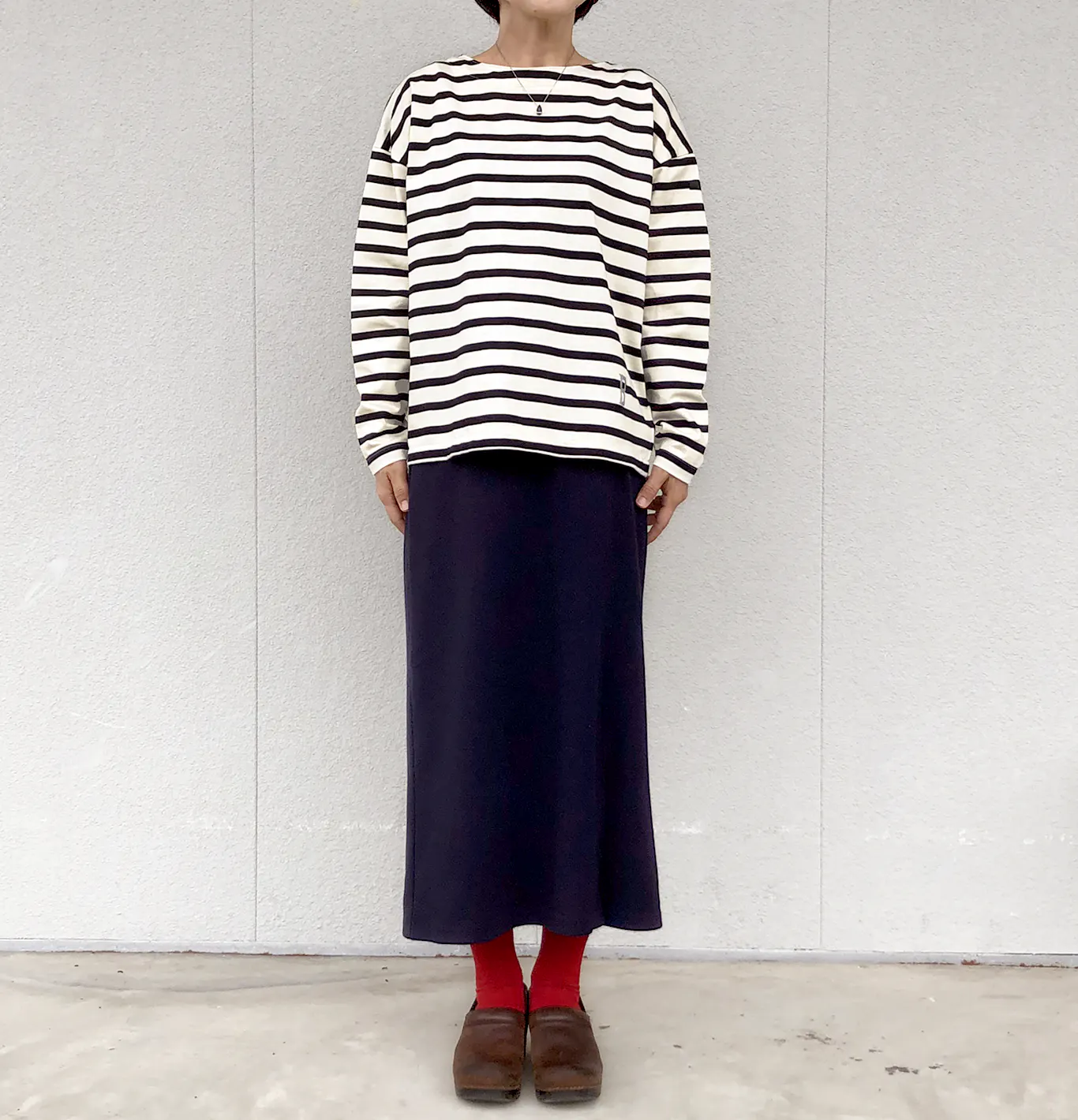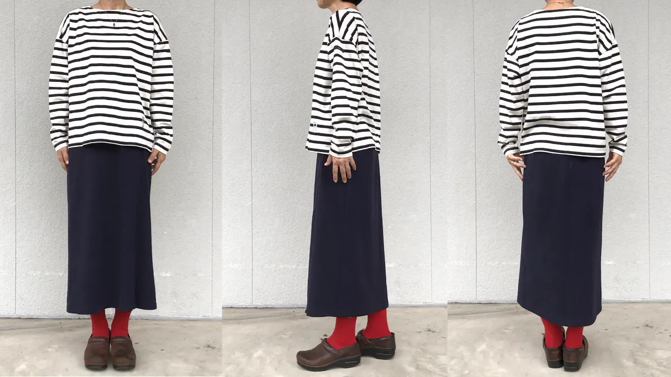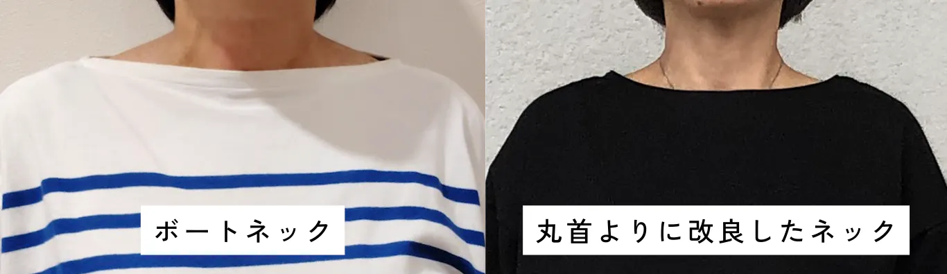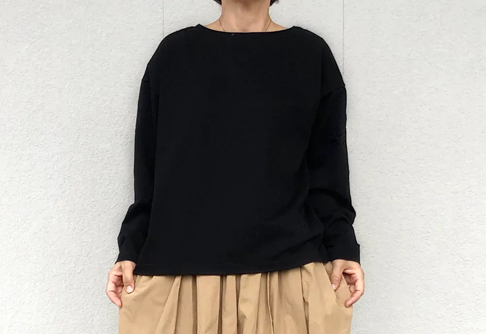 ボートネックの横に広がるラインを活かしつつ、少し深めにすることで首元のつまりを解消。