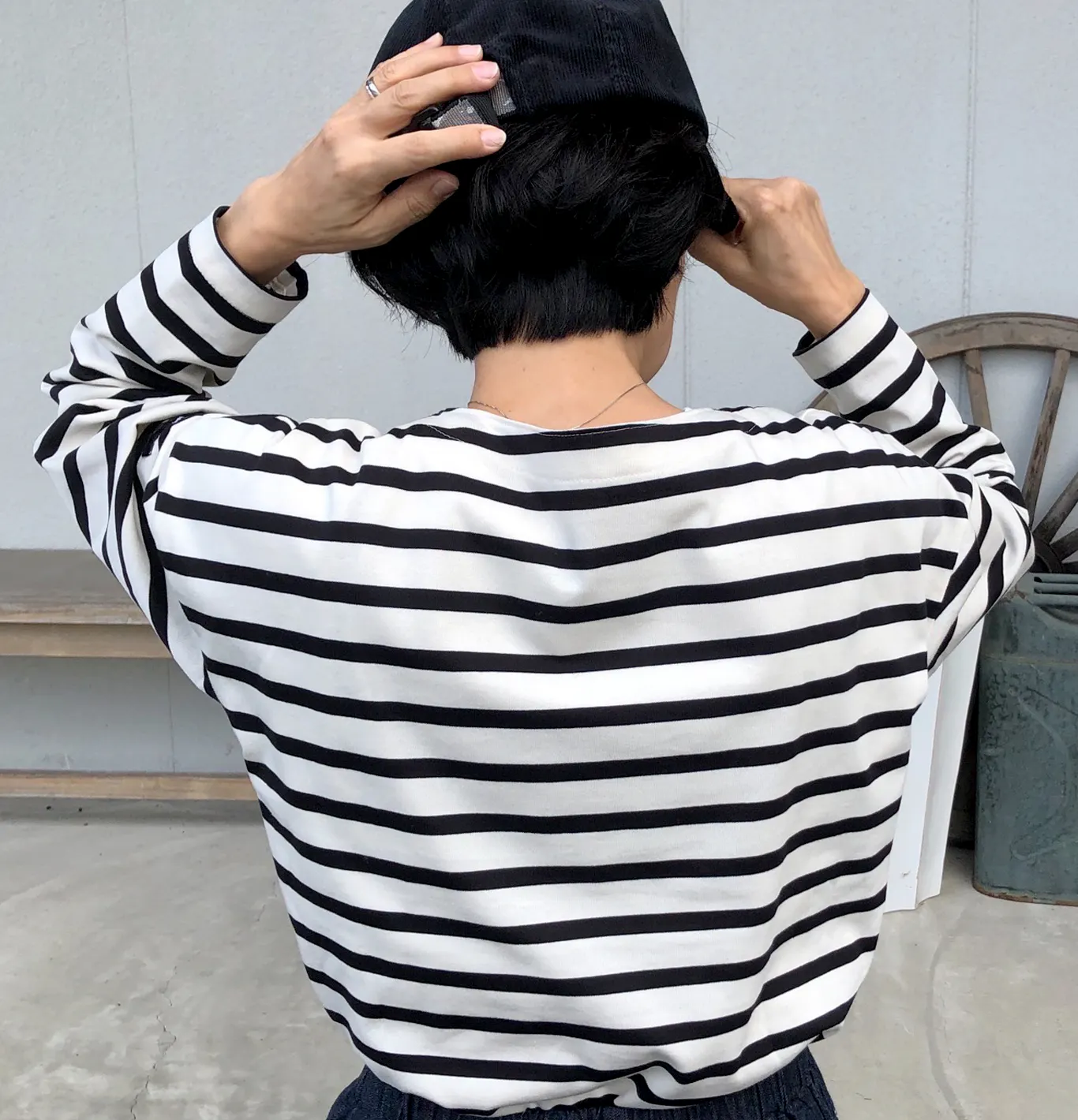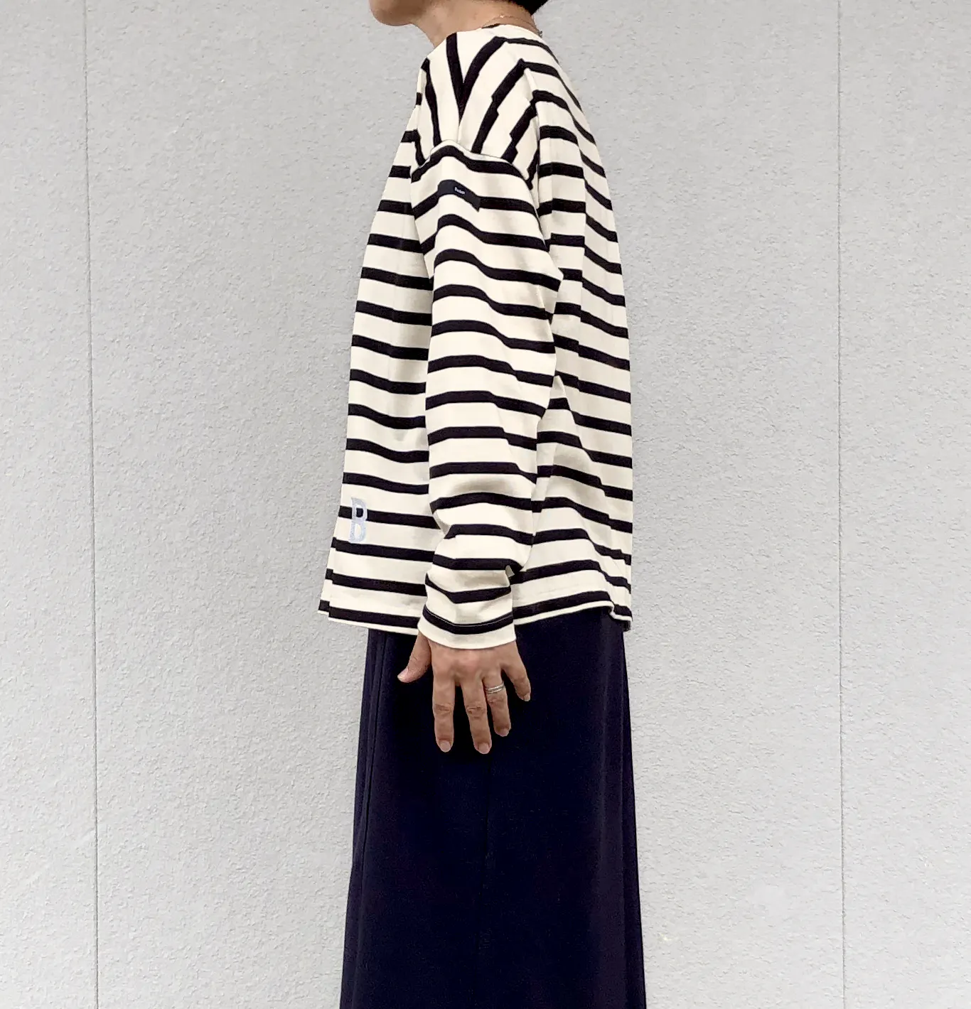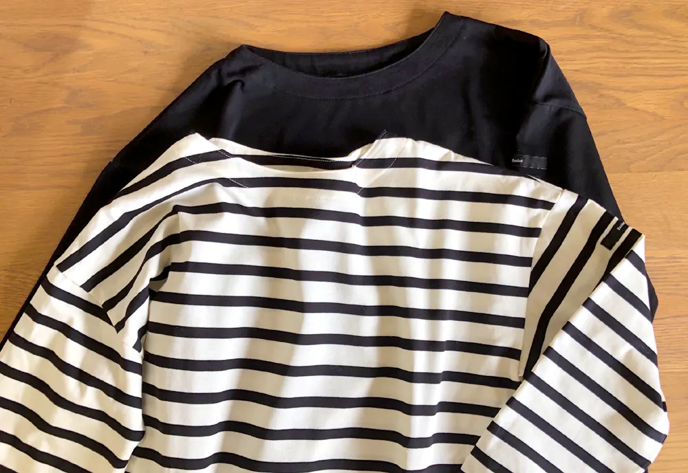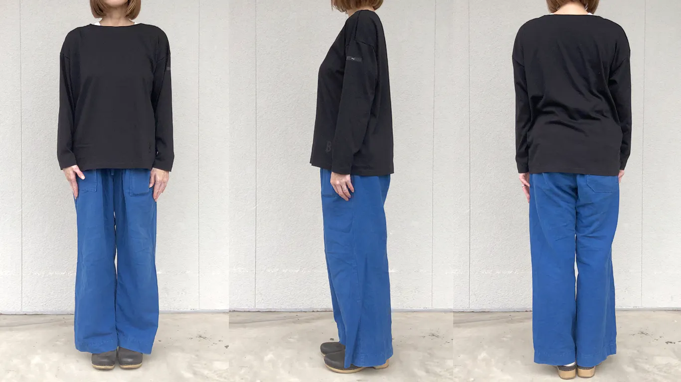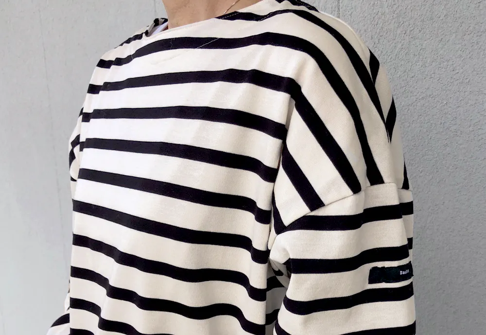 自然な開きで着脱がスムーズになり、肩の落ち感や抜け感など、バスクTらしい雰囲気もきちんと残しました。