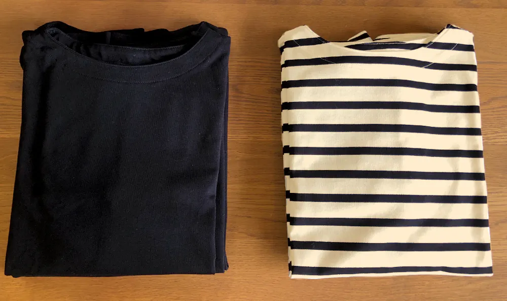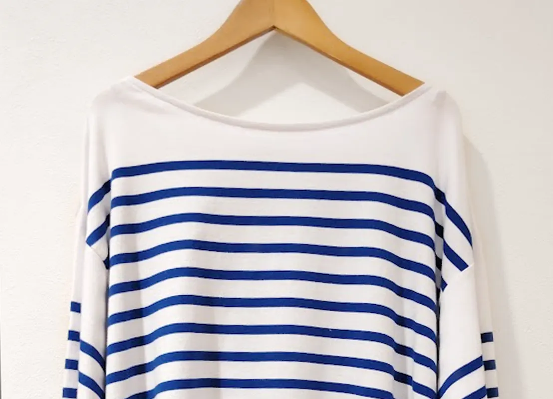 Basket Tシャツの基礎となったバスクTといえば、横に広がり、首元は少し詰まったボートネックが定番です。私たちも最初はその形で試作を重ねました。