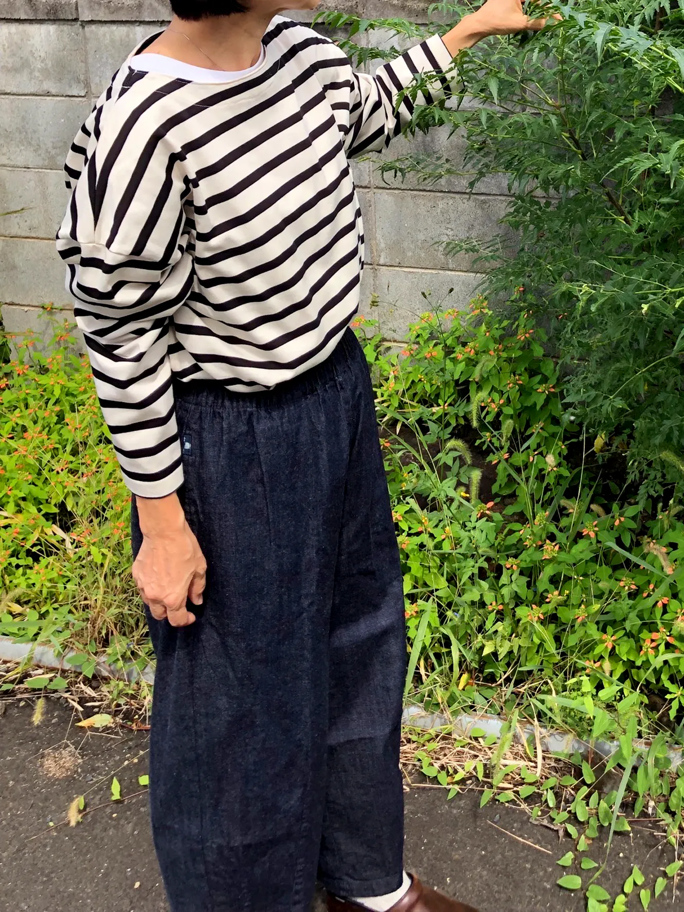 肩は自然に落ちるシルエットで抜け感を演出。
