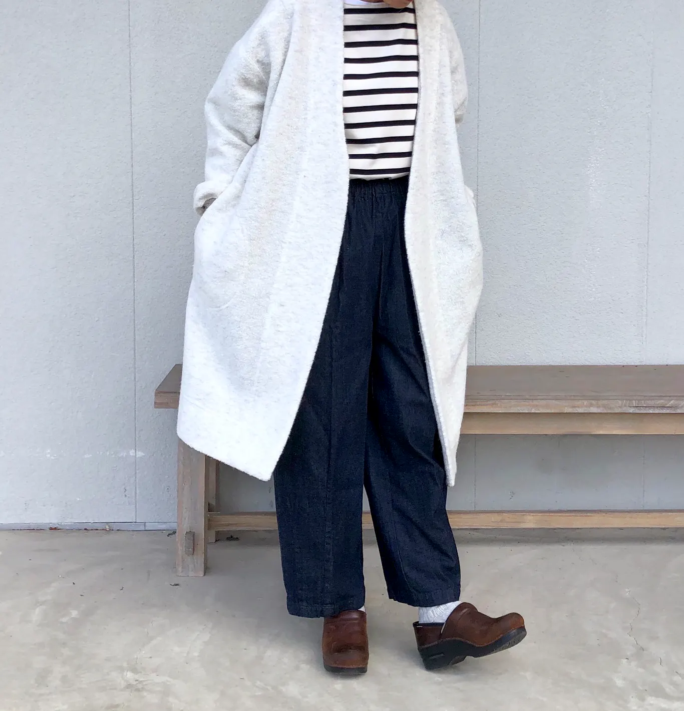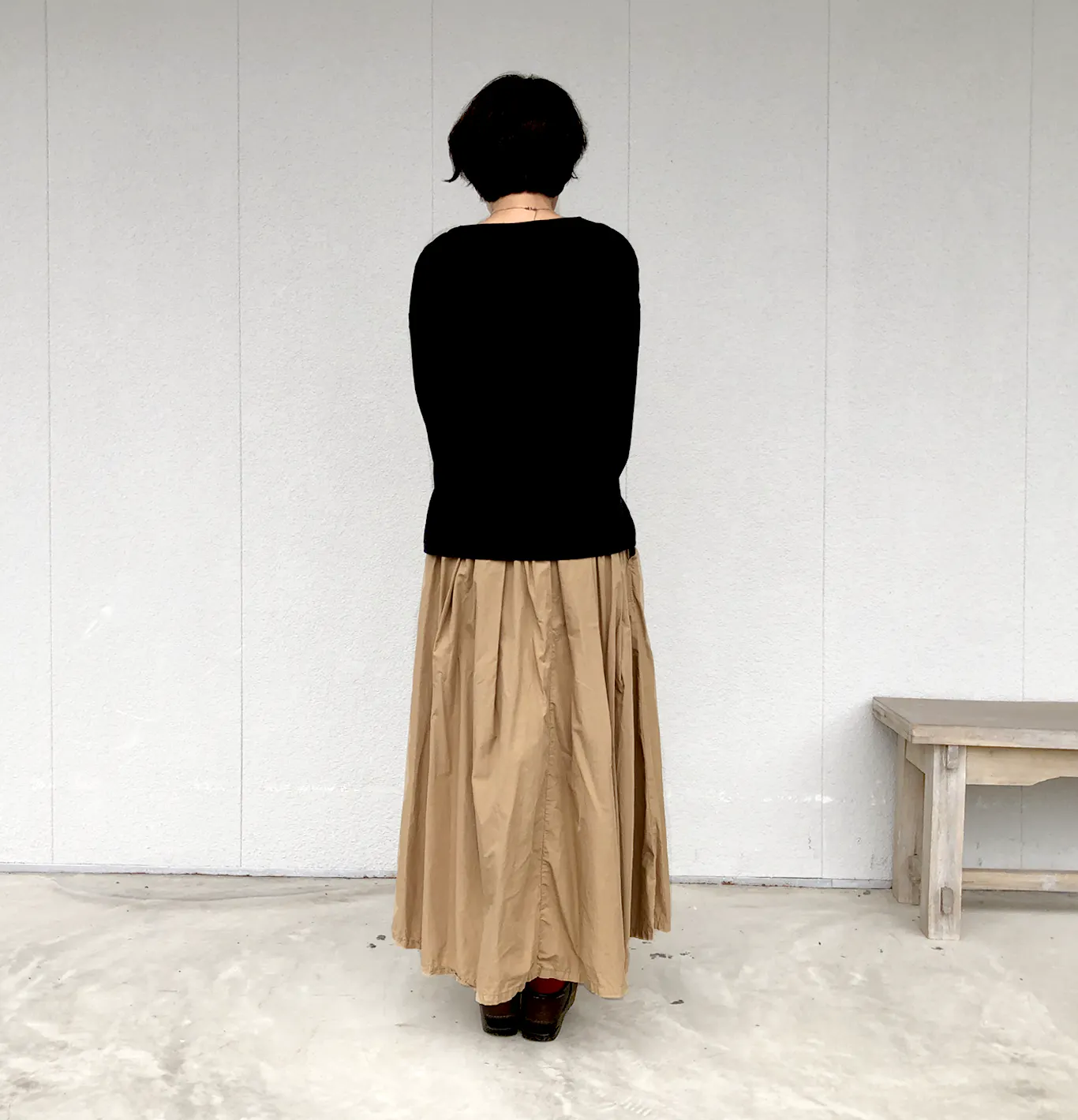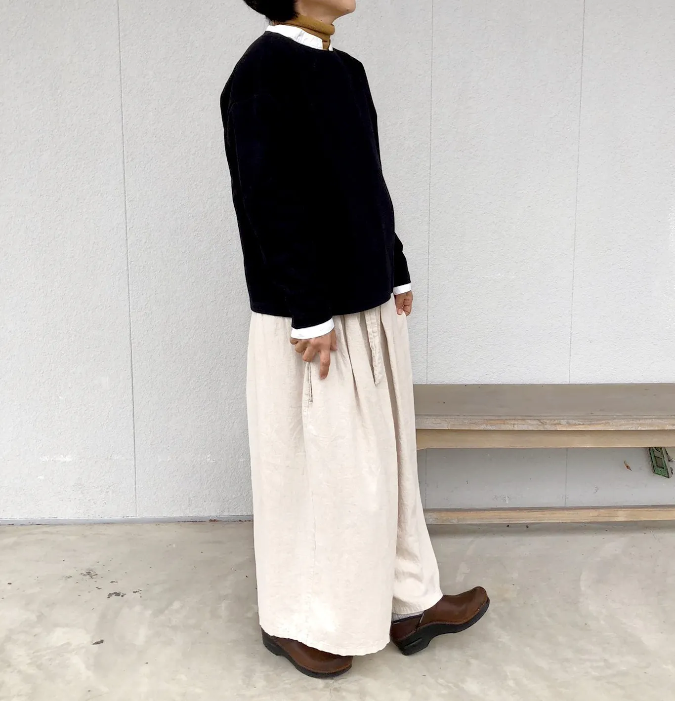 裾が広がったボリュームスカートにも、細身のパンツにも合わせやすく、1枚でコーディネートの幅を広げてくれる丈感です。