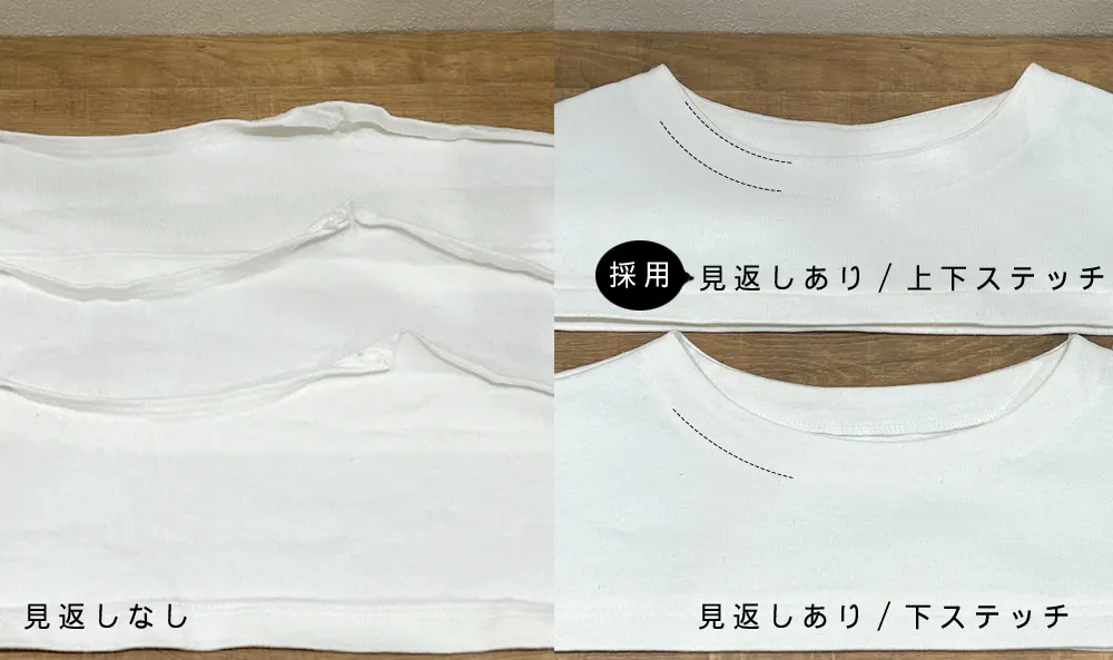 すると、生地の特性との相性から、着ているうちに首元が裏返ってしまう課題に直面しました。