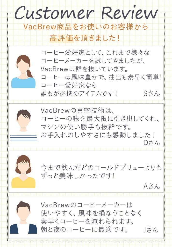 水出しコーヒーが好きで、よく飲むのですが、作るのに時間がかかることがずっと気になっていました。もっと手軽に、短時間でおいしいコーヒーが作れたらいいなと思って探していたところ、VacBrewに出会いました。
