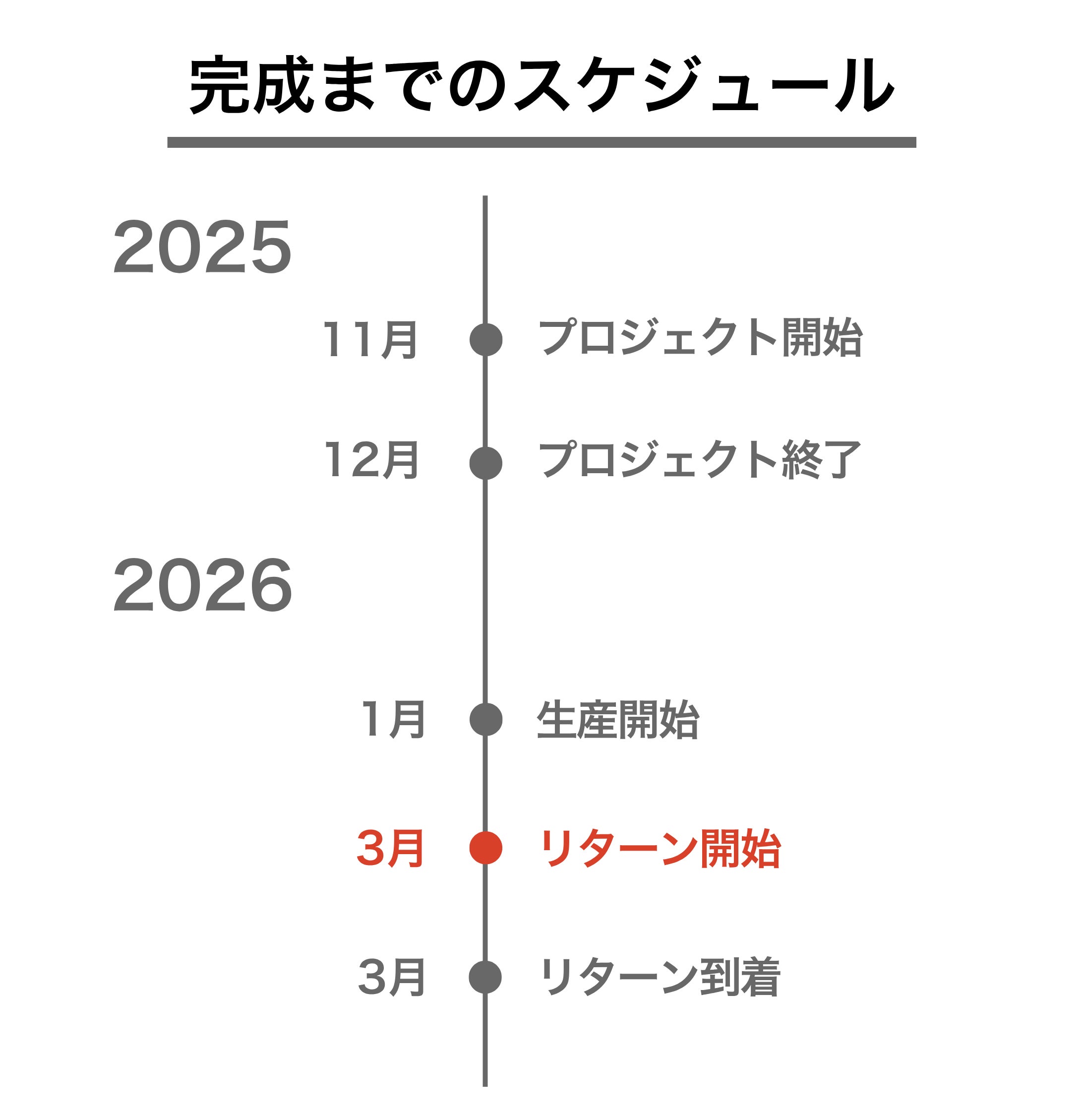 ※本文中に記載させていただいたスケジュールは、あくまでプロジェクト公開時点の予定です。クラウドファンディングを経て輸入を行う性質上、配送遅延のおそれがございます。