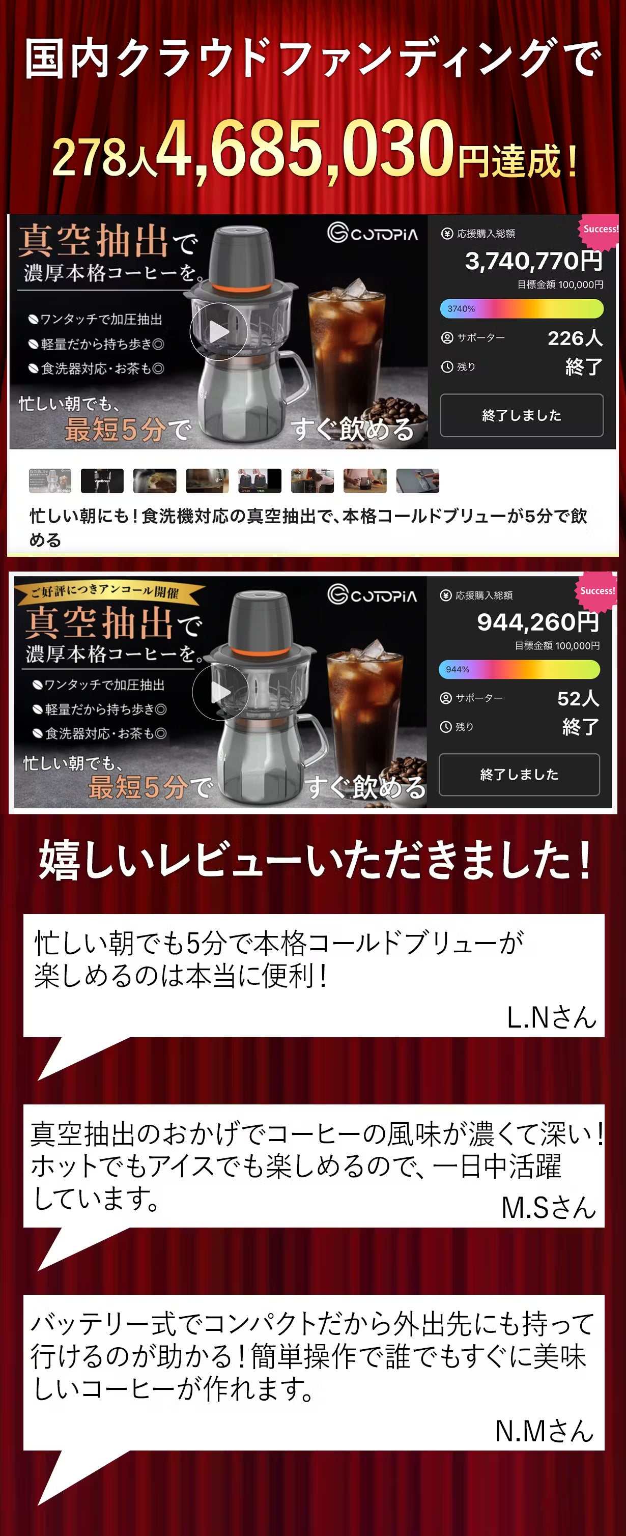 VacBrewは、真空の力を使ってわずか数分でしっかりとした味わいのコーヒーができるだけでなく、熱いコーヒーも淹れられます。持ち運びも簡単で、家でも外でも使いやすく、普段使いはもちろん、アウトドアにも大活躍なので、多くの方に喜んでいただけると思い、起案いたしました。