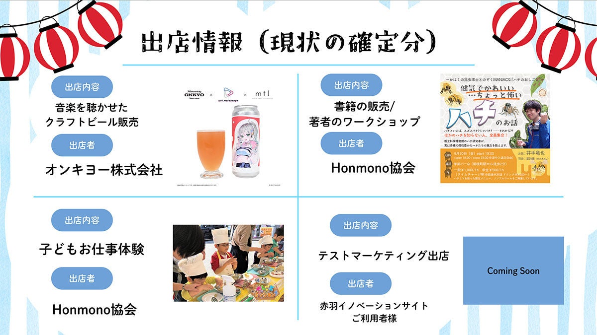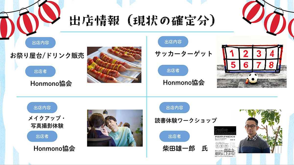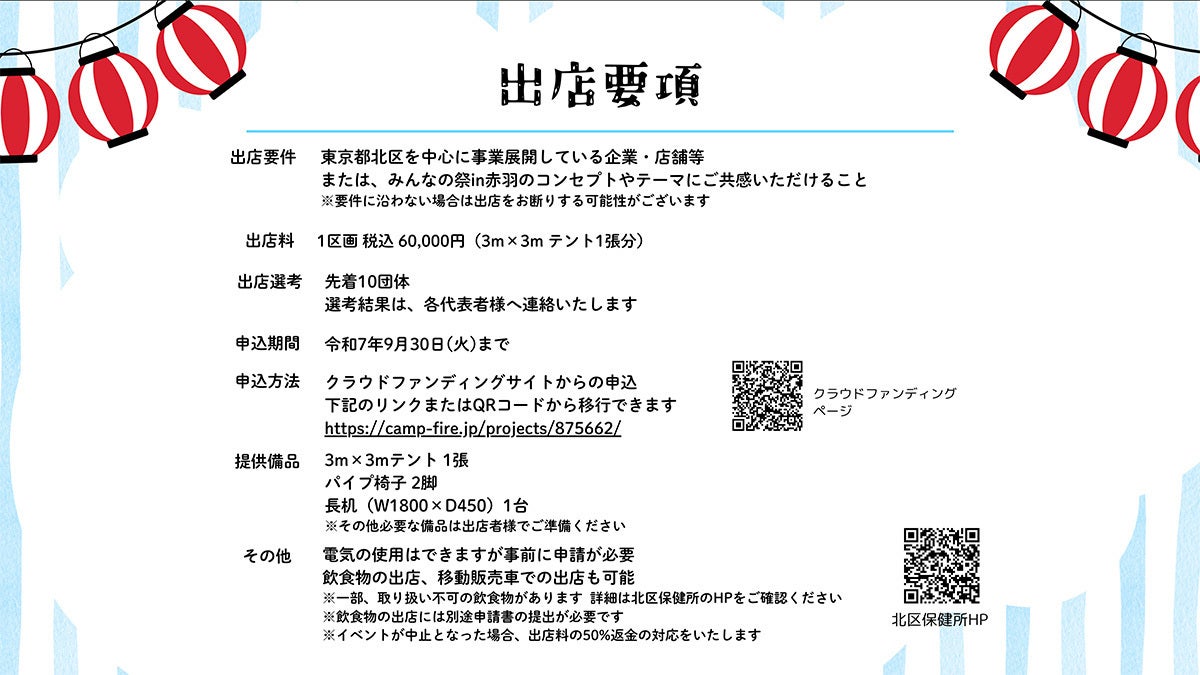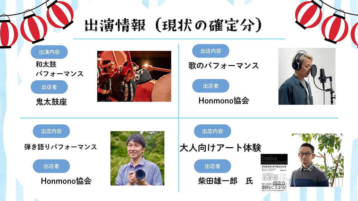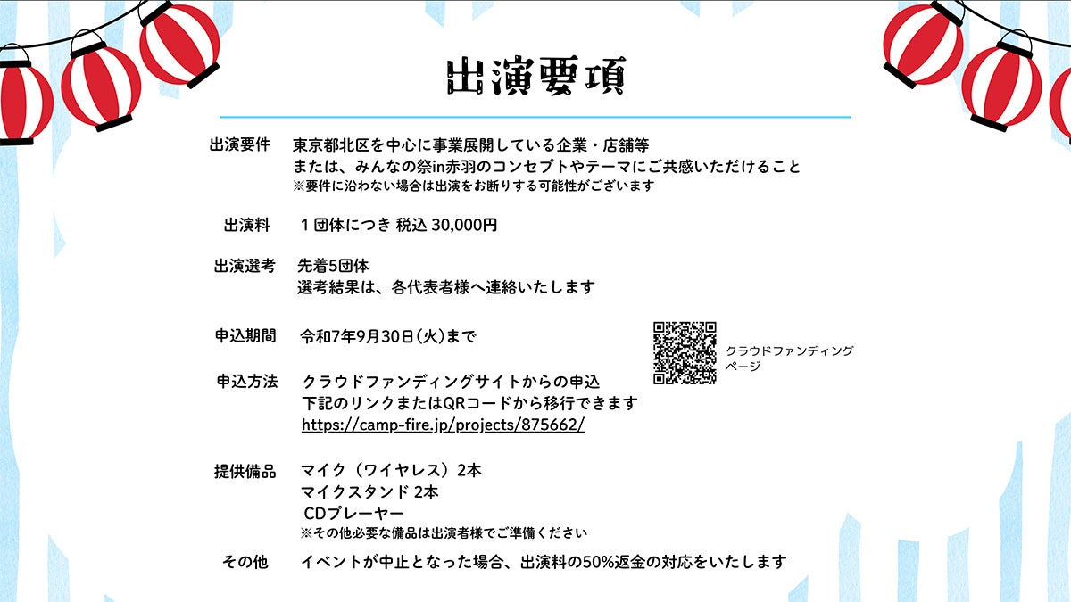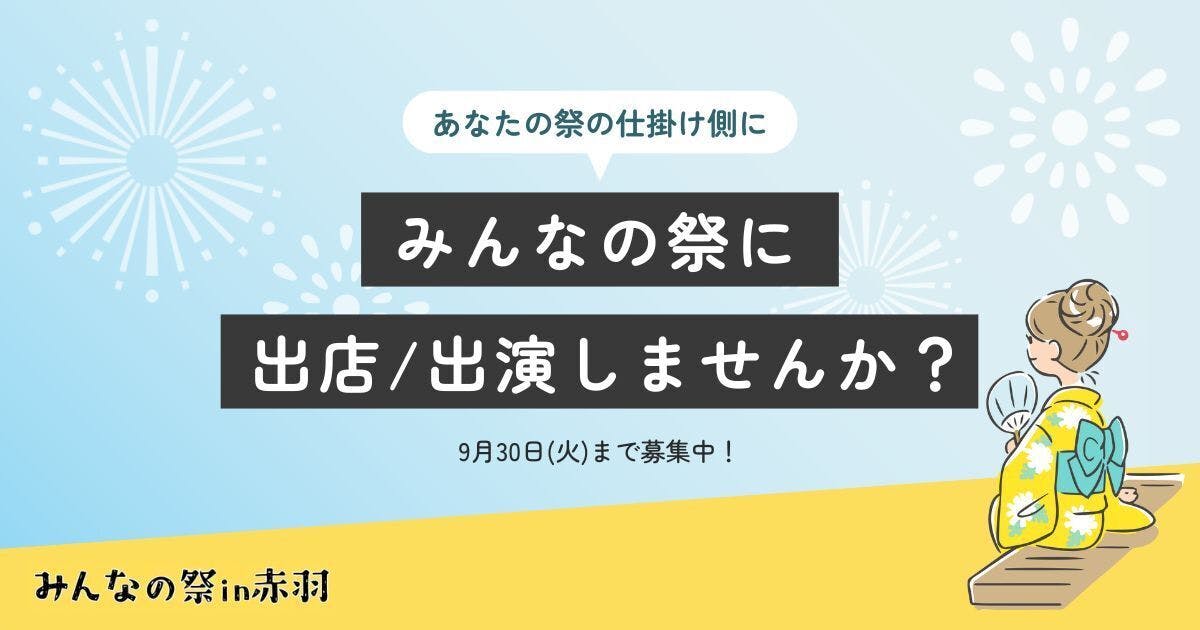「みんなの祭」では現在出店・出演者を募集中です。クラファンのリターンでも出店できる権利・出演できる権利をご用意しています。申込締め切りは9月30日(火)まで、気になる方はぜひチェックしてみてください!