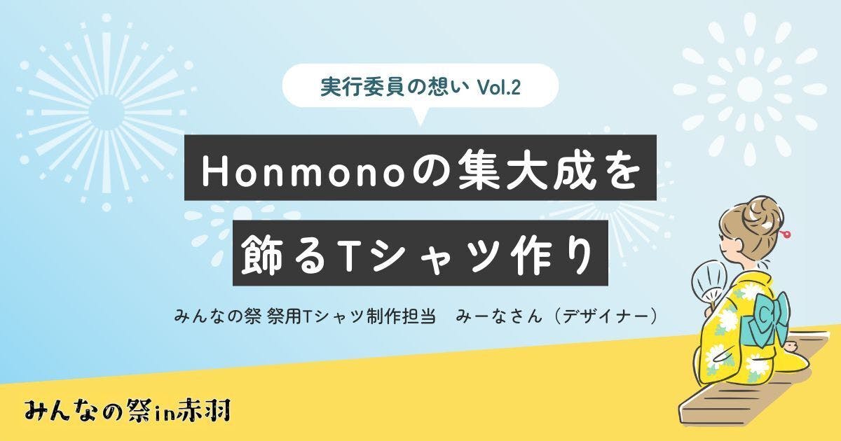 「みんなの祭」は大人も子どもも楽しめる企画であり、Honnmono協会の集大成ともいえるイベント。その大切な場にTシャツ制作という形で関われたことを、とても光栄に感じています。