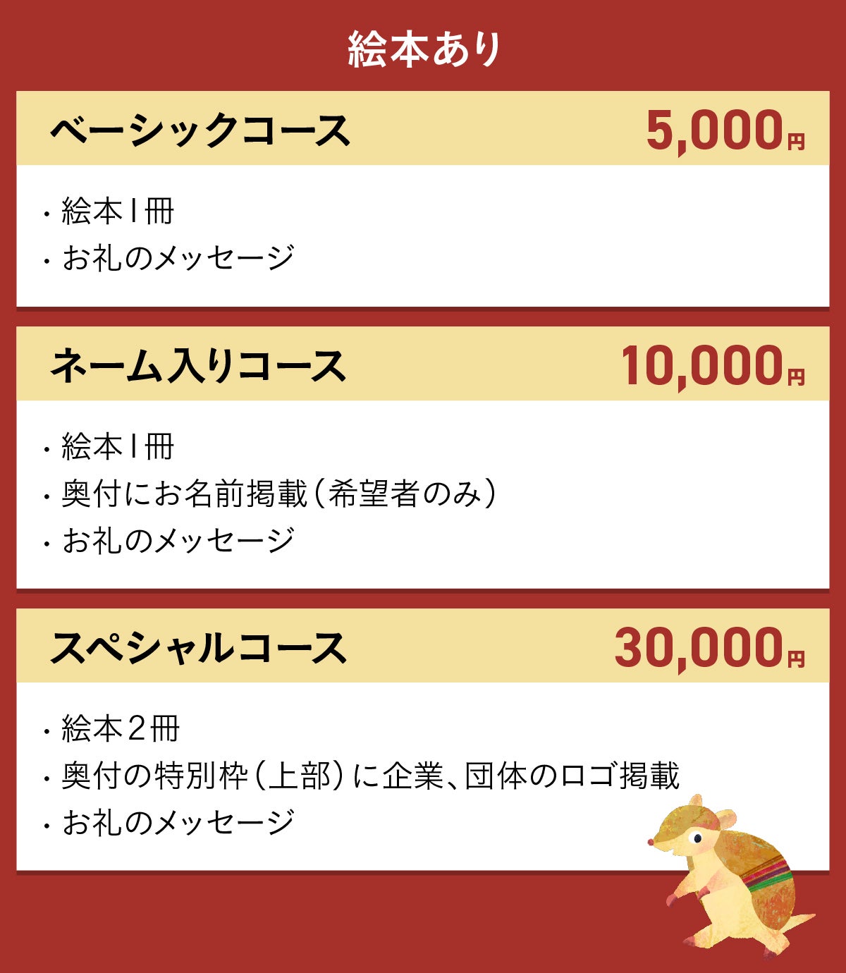 ※リターンは【絵本あり】と【絵本なし】の2種類をご用意しました。【絵本なし】は「物は不要だけど応援したい」という方に向けたコースです。ご支援金は絵本の制作費に活用させていただきます。