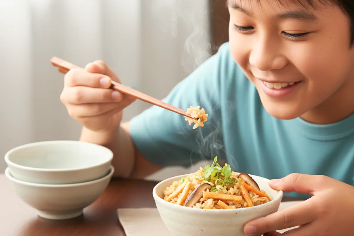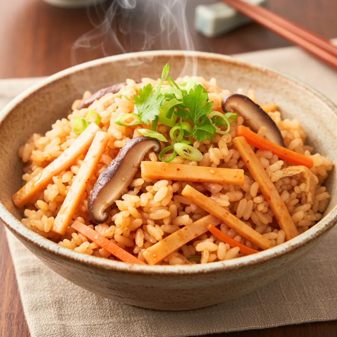◆ピリ辛の味付けを活かした【炊き込みご飯】メンマの調味液も、炊き込みご飯の味付けとして使えます!炊いても食感が残り、コリコリを味わえます。