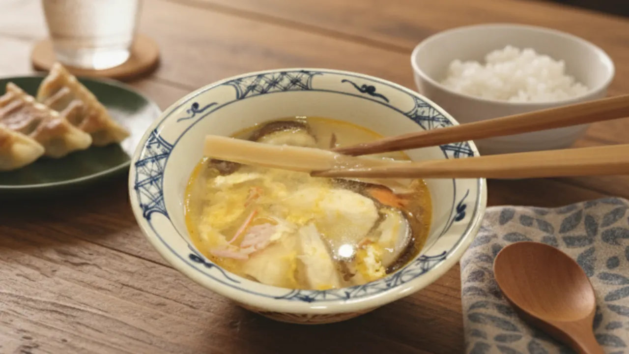 仕上げに溶き卵とお酢を加えて、さっぱりとしたスープに。
