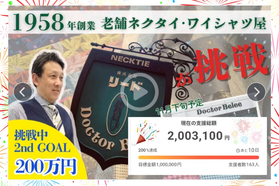 2025/10/23 10:00【ご挨拶】先日、目標金額達成のご報告をさせていただきましたが、この度、新たに設定させていただいたセカンドゴール(200万円)も見事達成いたしました!これもひとえに、目標達成後も「もっと応援したい」「より良いプロジェクトにしてほしい」という熱い想いでご支援を続けてくださった、全ての皆様のおかげです。心より感謝申し上げます。皆様のおかげで、私たちのプロジェクトは想像以上の広がりと可能性を得ることができました。いただいた貴重なご支援は、新設のショールームの照明や看板設置、店舗什器運搬のために、責任を持って活用させていただきます。プロジェクトの成功に向けて、最後まで気を引き締めてまいります。引き続き、応援のほどよろしくお願いいたします。株式会社リード代表取締役 澤木正志 もっと見る
