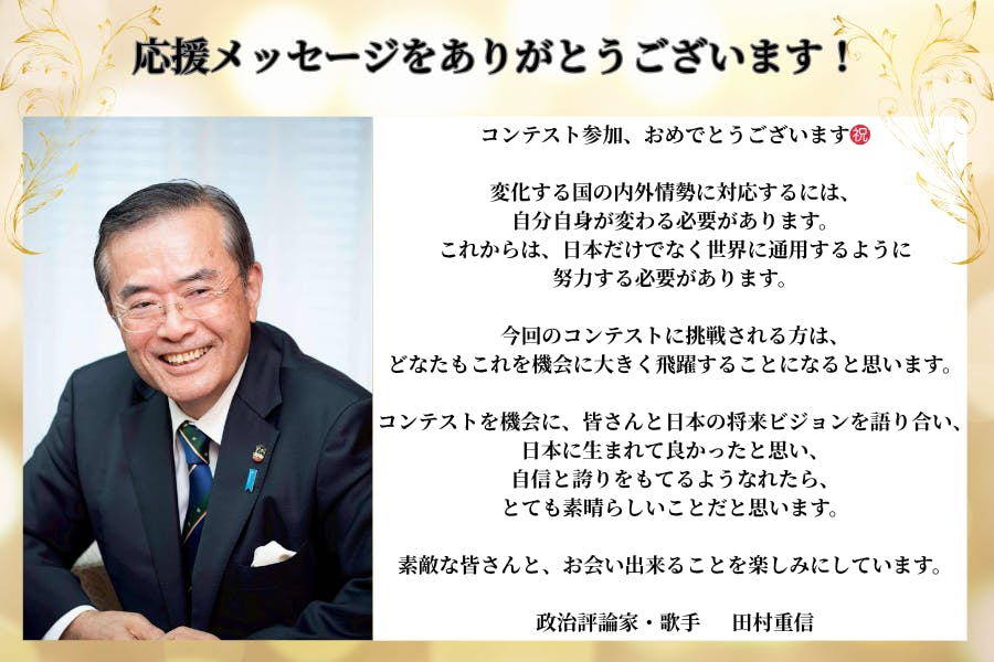以下、数多くの素晴らしい方々より応援メッセージを頂きましたので掲載させて頂きます。(掲載順:順不同)
