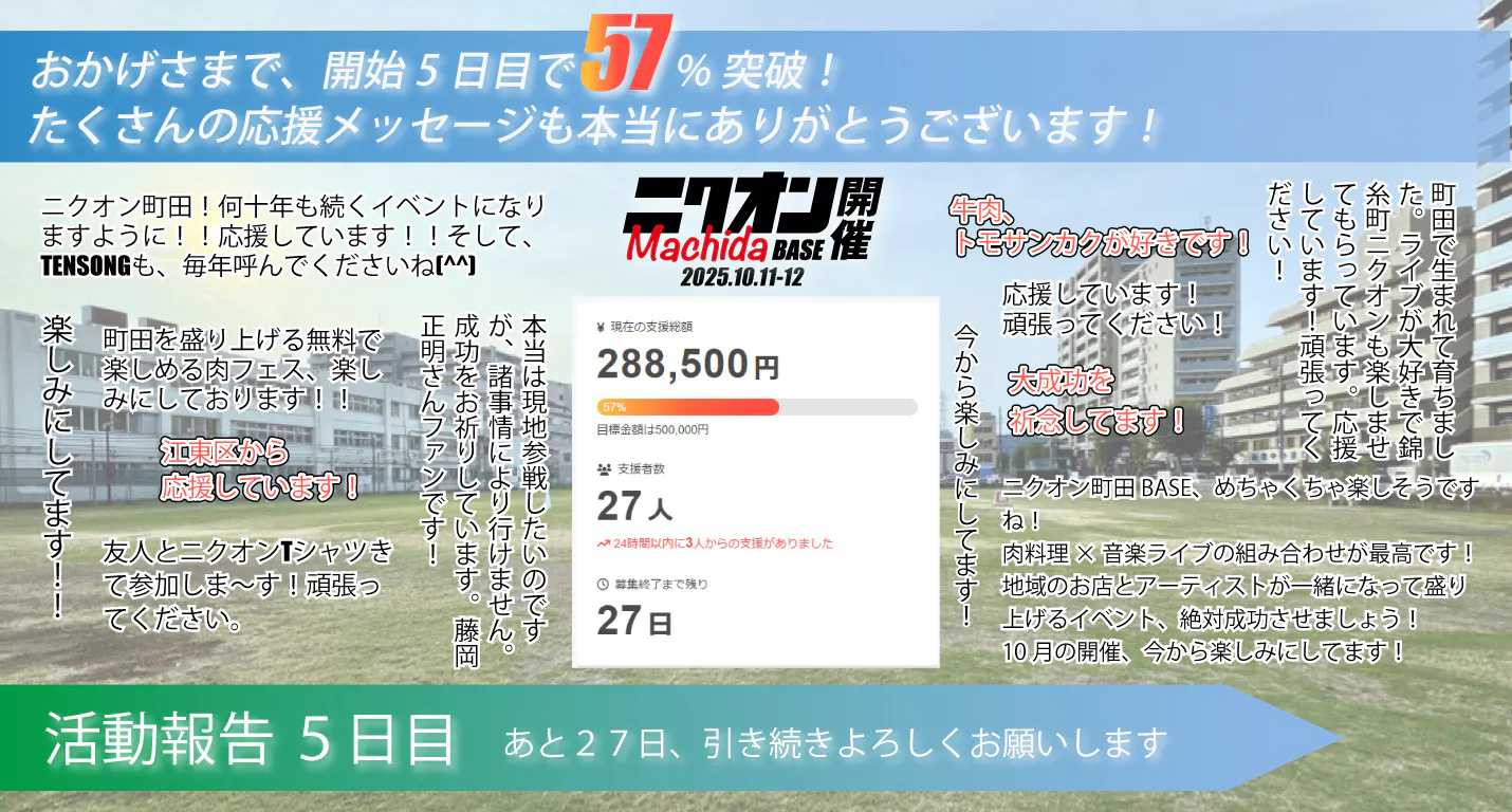 ニクオン町田BASEのクラウドファンディング、開始から5日目で【目標の57%・27名の方】にご支援いただきました!温かい応援メッセージも本当にありがとうございます。
