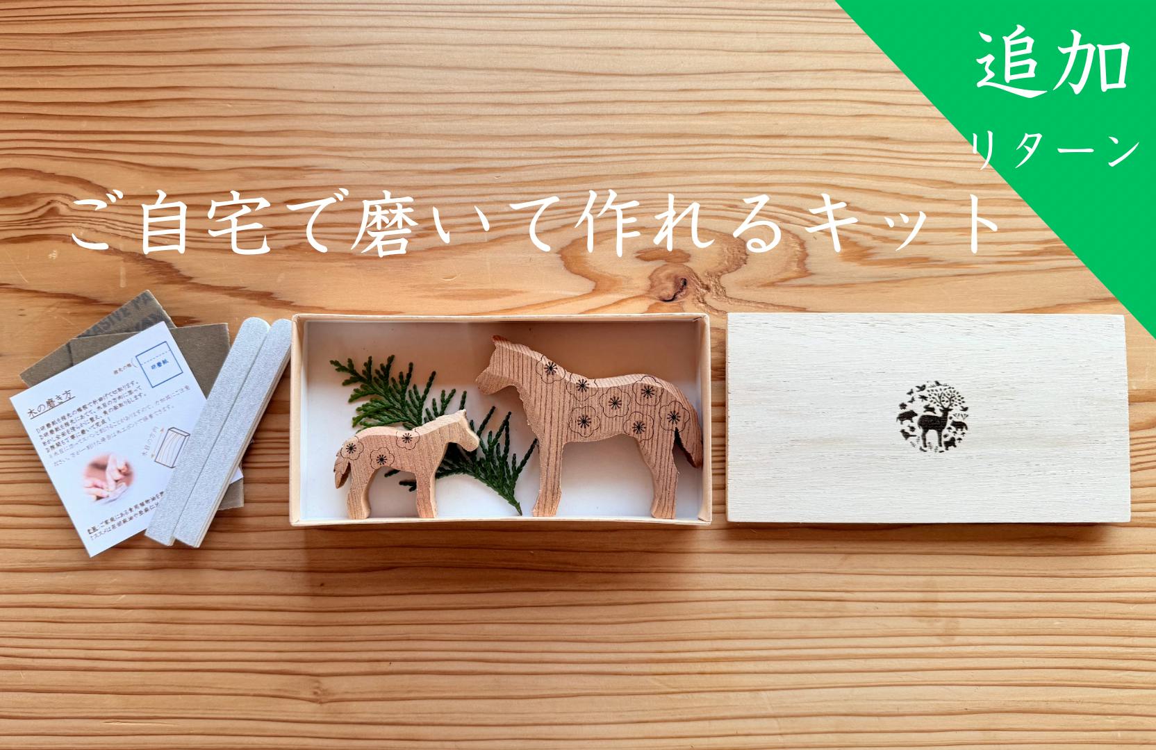 2025/11/10 14:15ご要望をいただきまして、リターンを追加しました!親子の「森の願い馬」製作キット 内容:森の願い馬親子、研磨紙、研磨スティッ ク、磨き方説明書 、森からのお手紙ご自分用はもちろん、親子2頭なのでご夫婦やお子さまと一緒に磨いたり、贈り物にも。おうちで製作できるキットです。木くずが出るので新聞紙等を広げた上で木を磨き、お持ちの植物性油(匂いのくせのないサラダ油などでOK)を塗りこんで仕上げてください。 木の香りに包まれて磨く時間は「自分と向き合える時間」に。 もっと見る応援メッセージをいただきました!