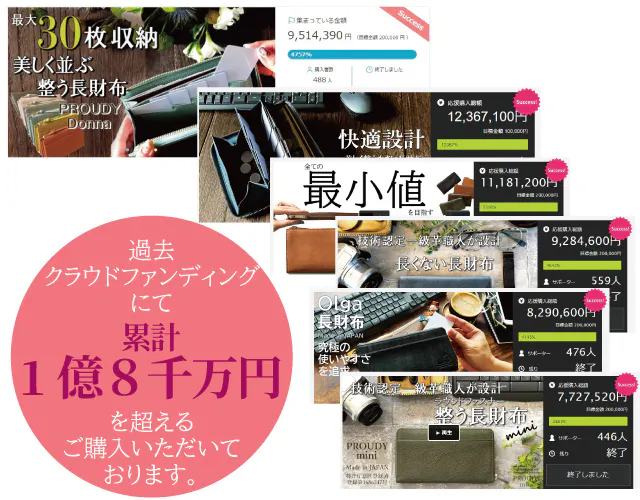 ご購入頂いた方に満足して頂ける「こだわりのモノ創り」を常に念頭において商品開発をしています。革製品を第一線で30年以上作り続けて培った技と知識や経験。そして国内外の多種多様の革を触り、仕立てた経験から、革の良し悪しを識別する事ができる利点を生かした素材選びによって弊社の製品が完成しています。過去プロジェクトで累計1億8000万を超えるご購入をいただいております。