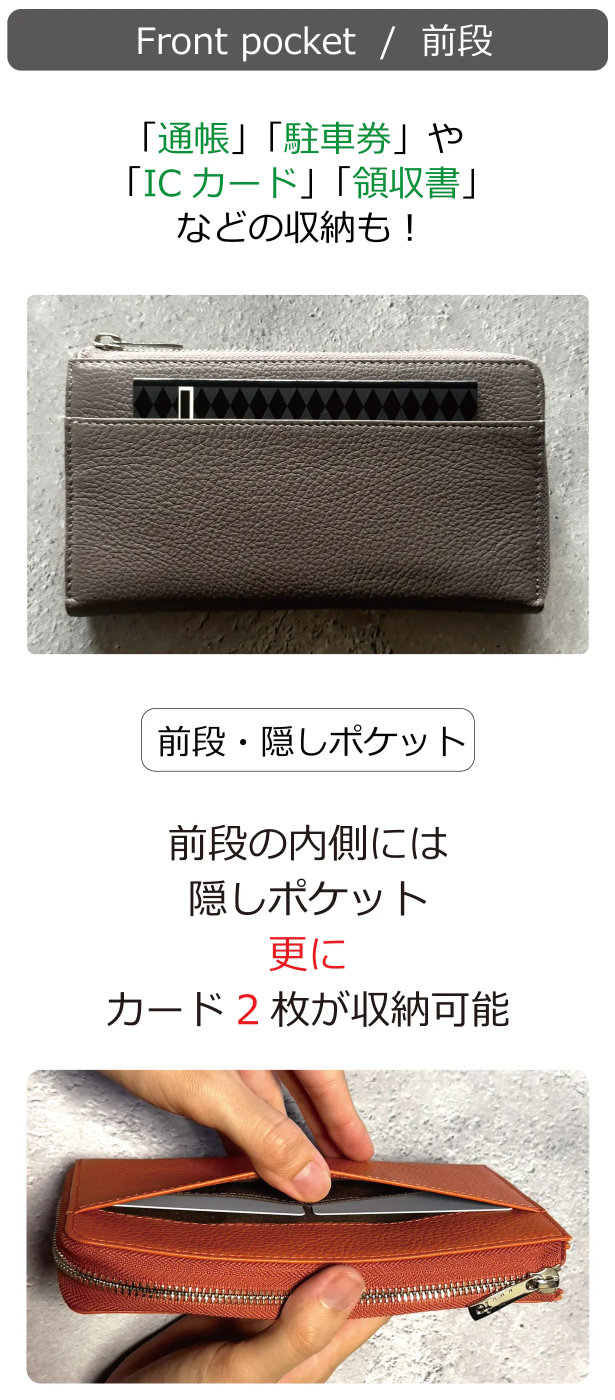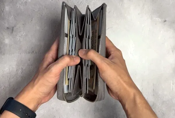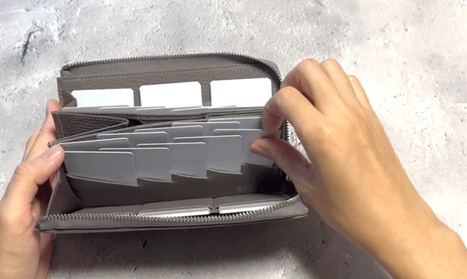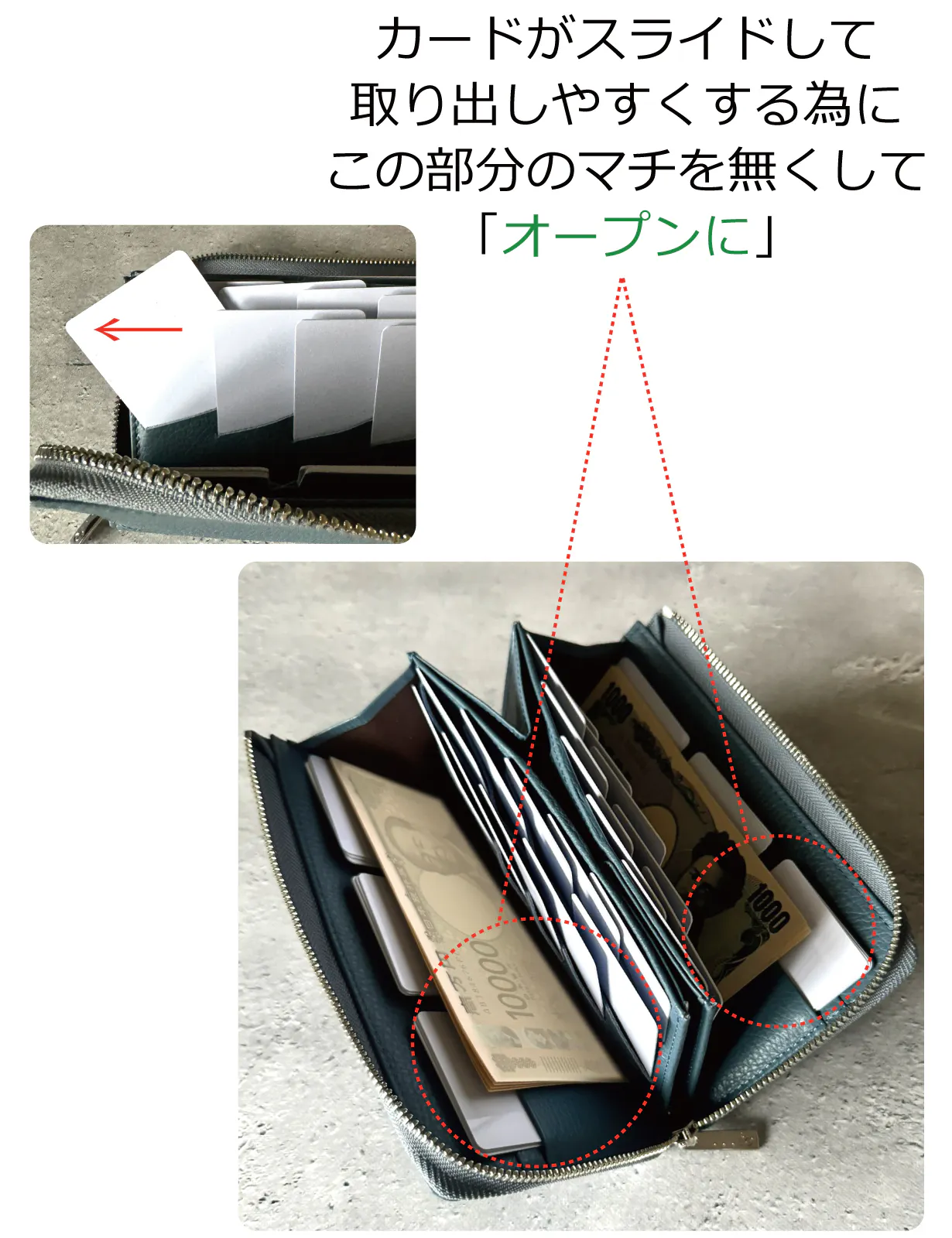 これにより財布自体が膨らみづらくなります。さらにファスナ―への負担軽減にもつながります。
