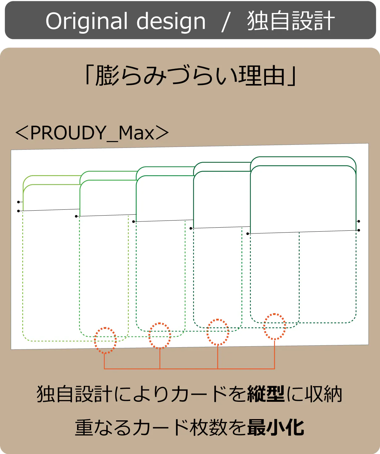 「PROUDY_Max」は解説画像の様に中央のカード段に10枚入れてもカード同士の重なりが最大4枚になる仕様です。