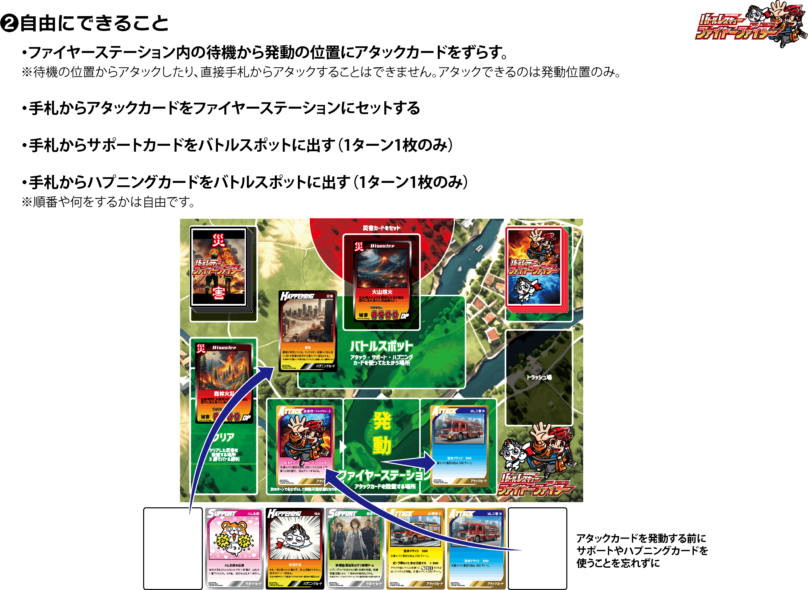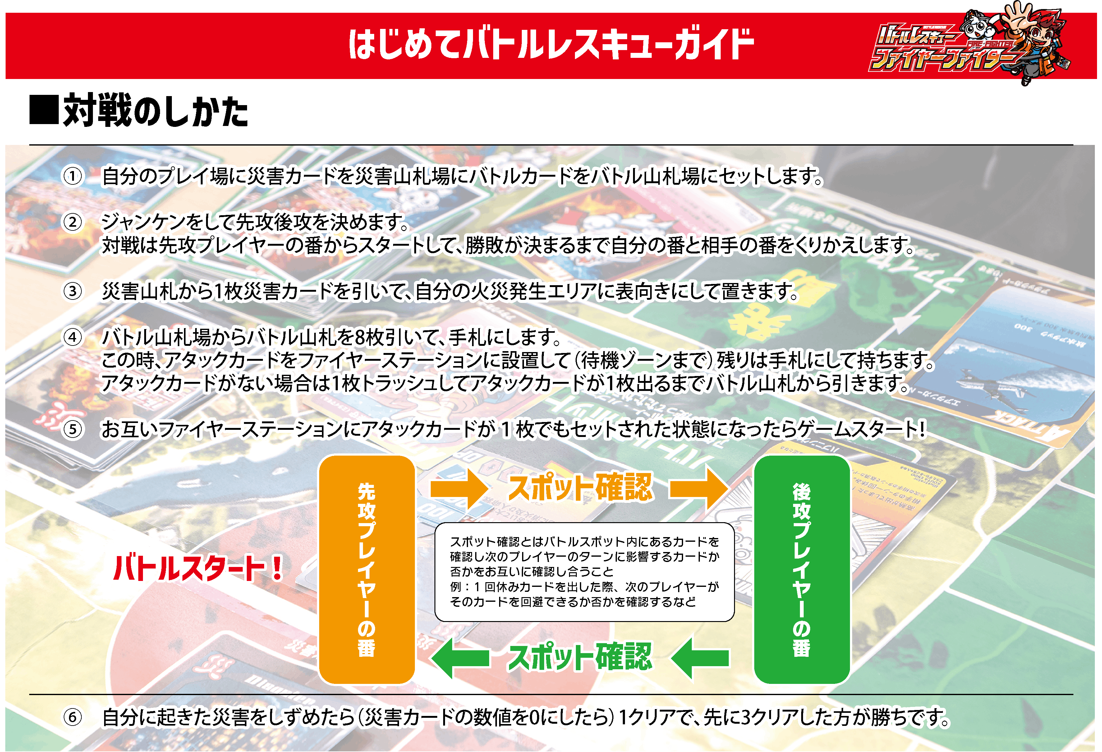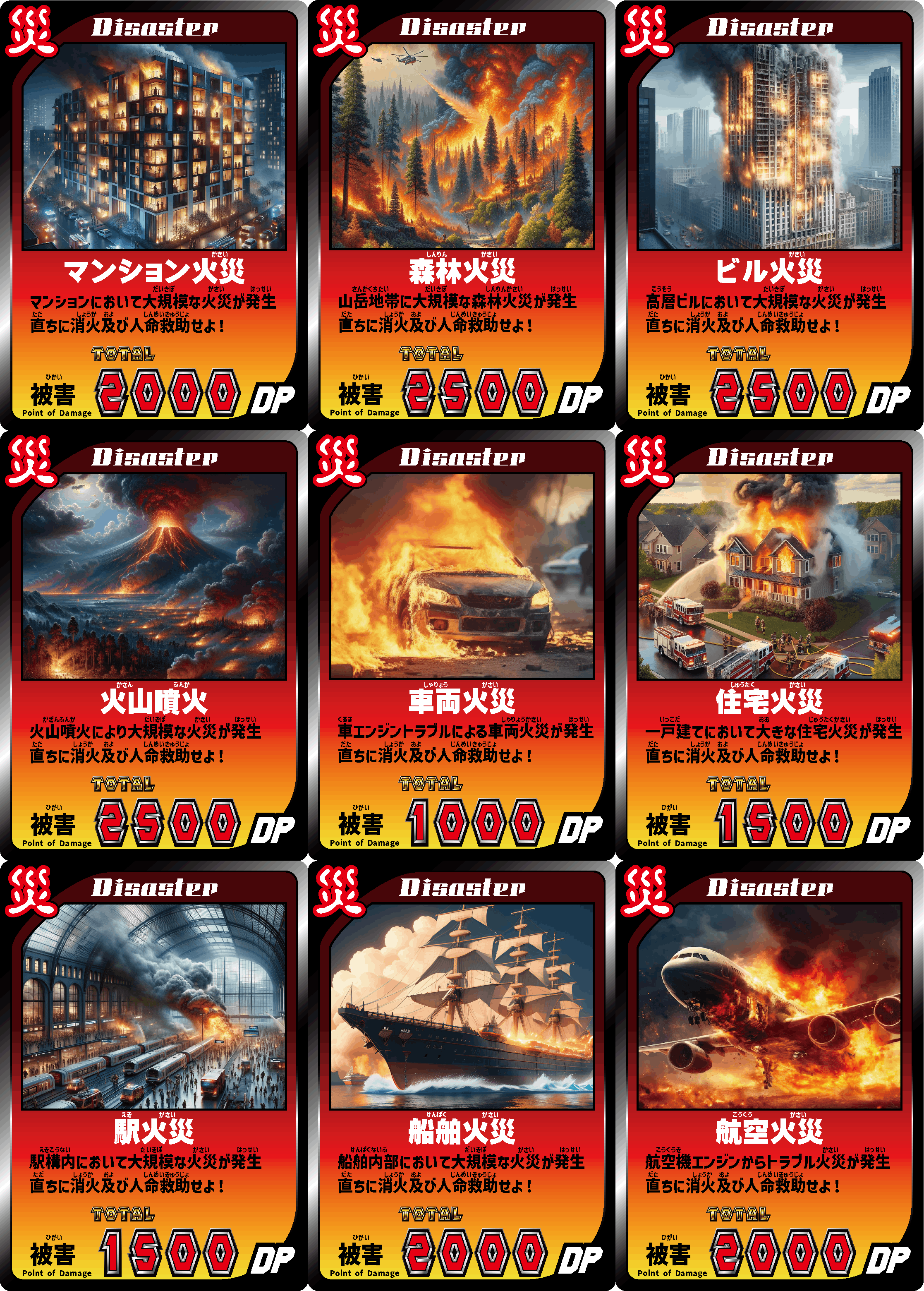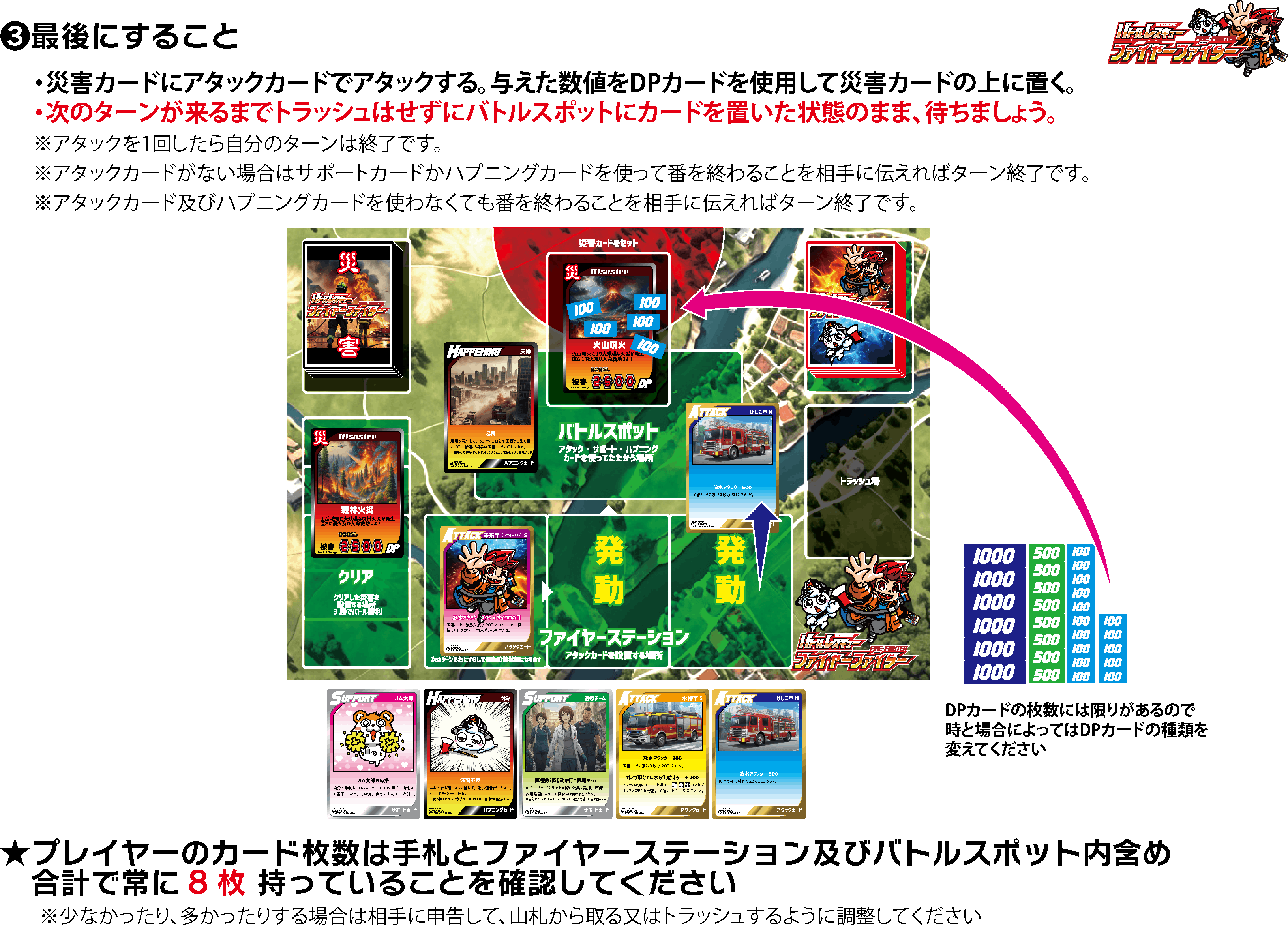 以上、災害カード9枚とバトルカードの枚数合計50枚を使用して、対戦します。