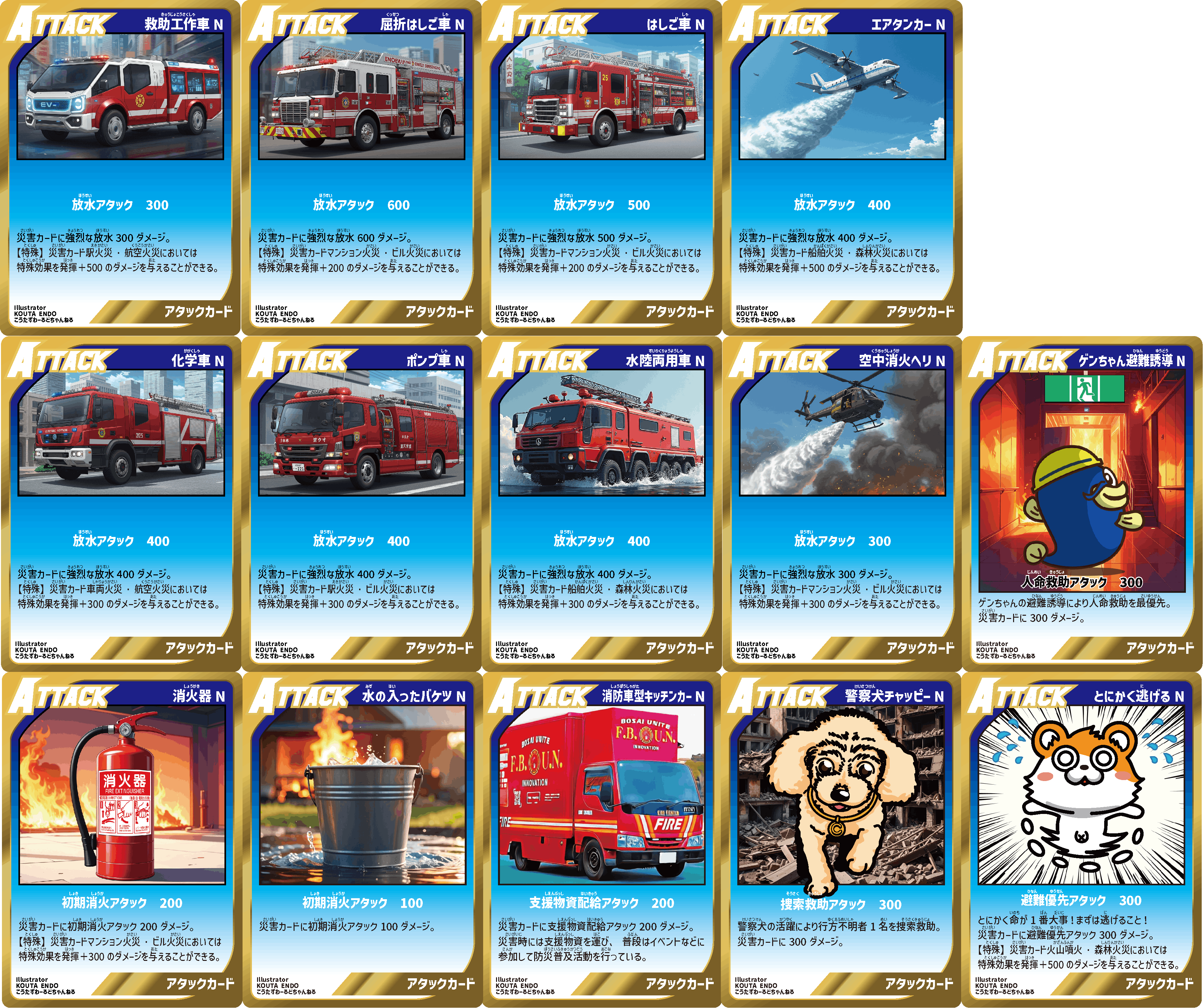 最初はまず、防災をイメージしやすい”火災”をキーワードにして“身に襲い掛かる災害カード”を、消防士やレスキュー隊、特殊装備などの“アタックカード”を使ってゼロにしていく極めてシンプルなルールにすることで、大人から子どもまで遊びながら災害対策や防災の意識を高めるというものです。
