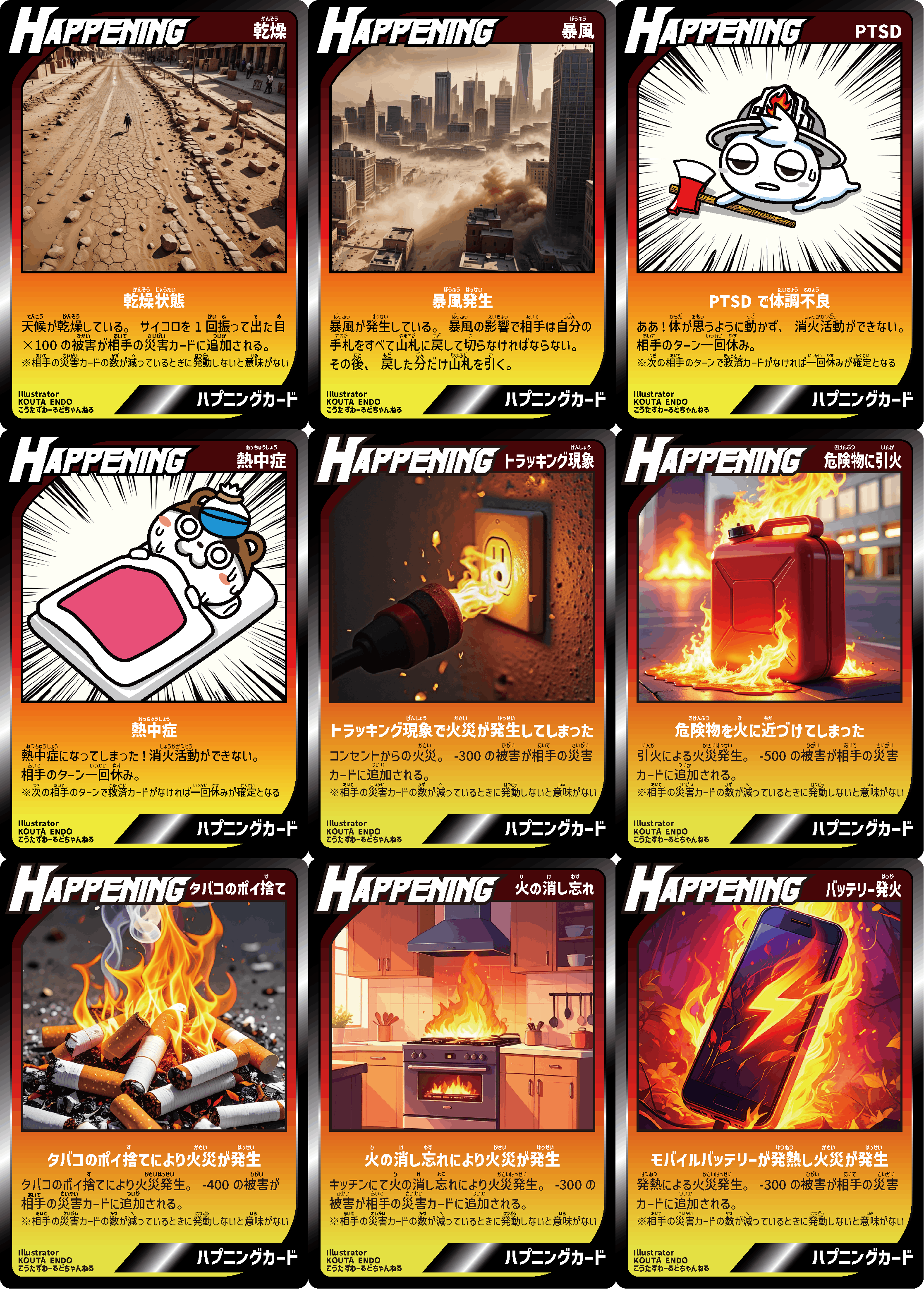 初めて実施させていただきましたが、今までのカードゲームの要素を取り入れつつ、各火災現場に応じた消防士の資機材や車両、仲間達を活躍し鎮火する仕組みはすごく新鮮で楽しめました!コンボカードを活用した戦術やハプニングカードやサポートカードで防災の事も学べると感じました! 大人から子供もできるカードゲームでハマりそうです!