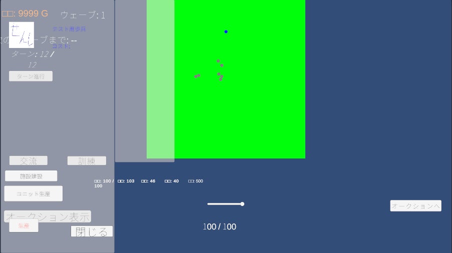 こちらは、本作の核の一つである、リアルタイムストラテジー(RTS)パートの実際のゲーム画面です。 現在はまだ仮の『丸いだけのユニット』たちが動いているだけですが、基本的な戦闘システムは既に機能しています。