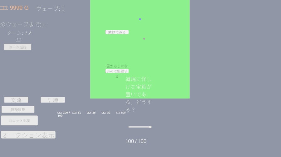 こちらは、ターンを進めることで発生する、イベントシーンの画面です。 現在は、まだテキストだけですが、選択肢によって物語が分岐するノベルゲームの根幹部分は既に完成しています。