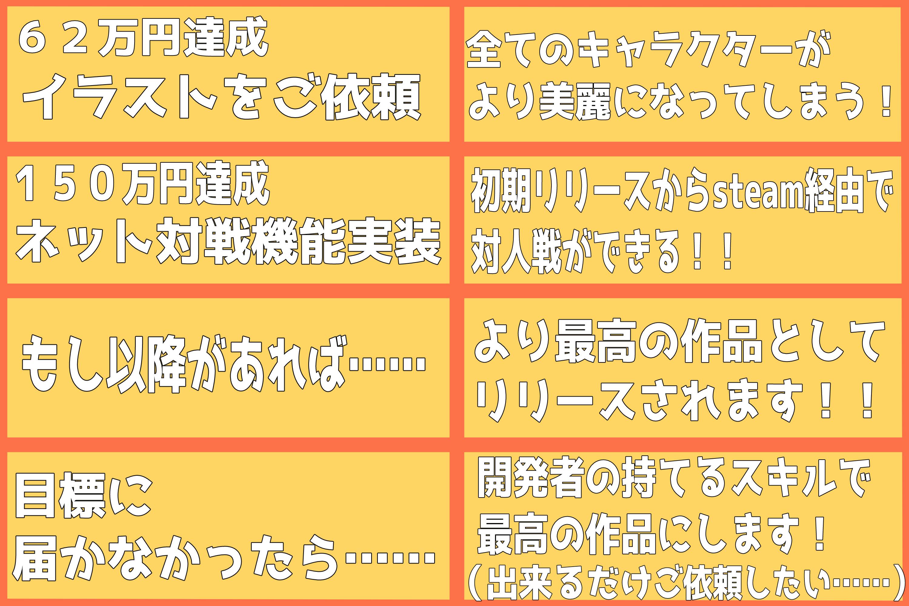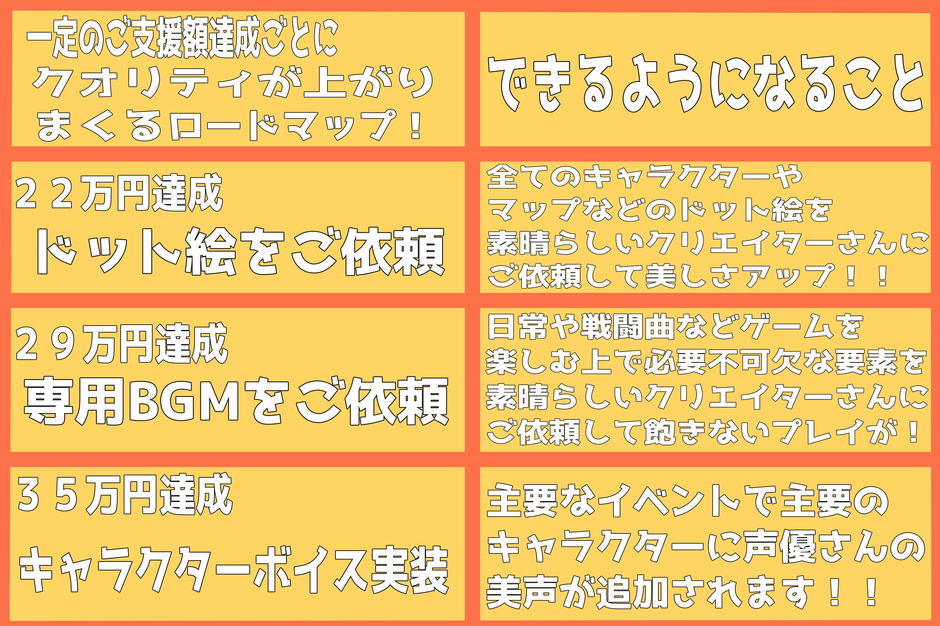 皆様から集まった支援総額に応じて、以下のロードマップに沿って、尊敬するクリエイターの方々への協力を依頼し、ゲームのクオリティアップを実現していくことを、ここに宣言します。