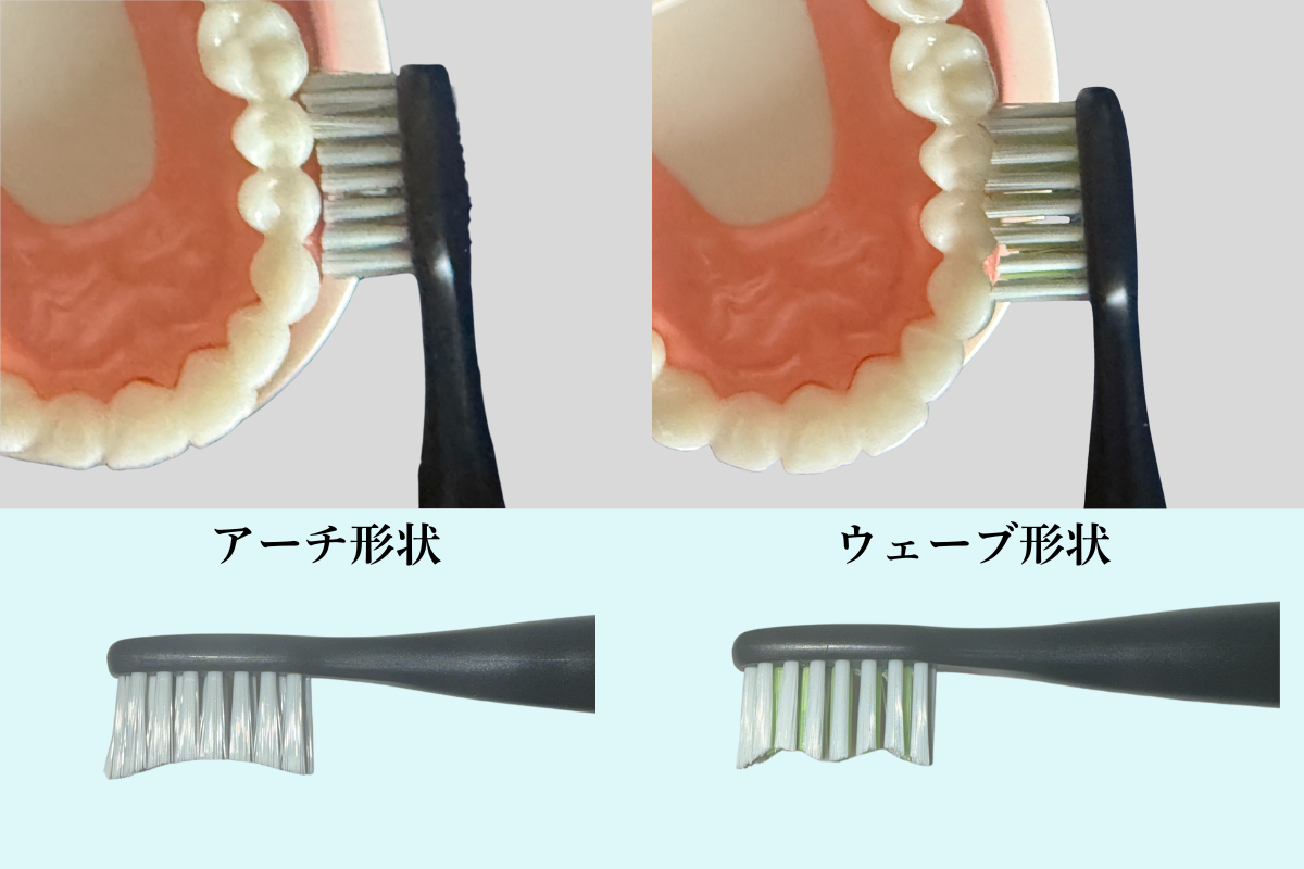そのため、新タイプでは歯の形状にフィットし、効果が格段に上がる「ウェーブ型」へ改良しております。