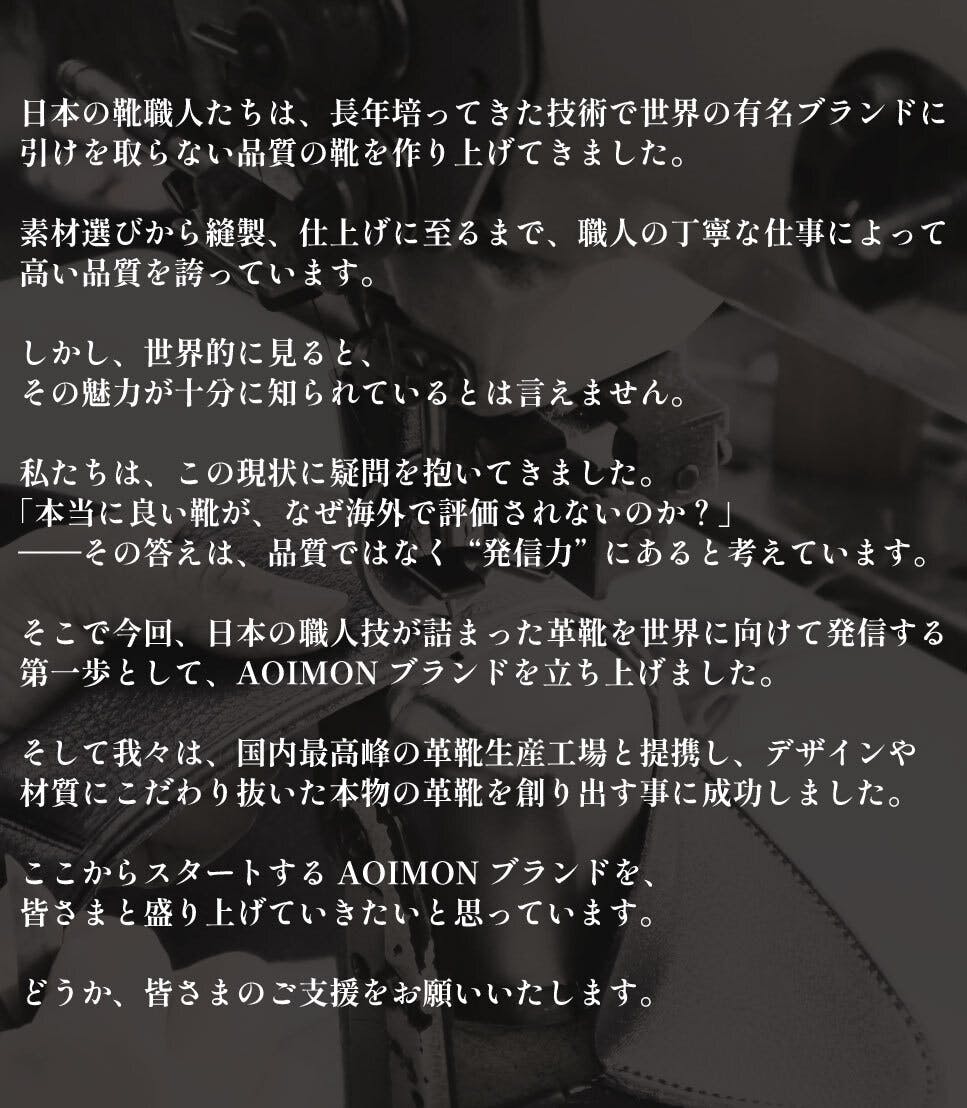 「AOIMON」は、日本の伝統文化に根差した価値観を、世界中の足元へ品格と魂を宿す高級革靴ブランドとして誕生しました。