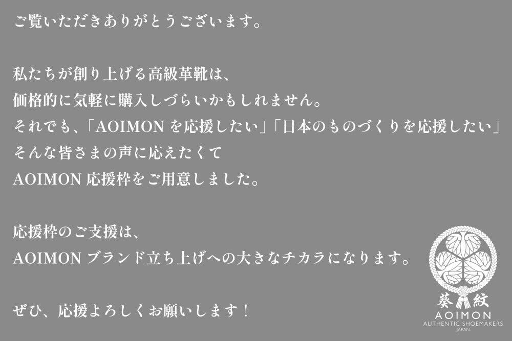 2025/09/14 12:29【目標金額達成の御礼とNEXT GOALへの挑戦】この度は、私たちのクラウドファンディングにご支援いただき、誠にありがとうございます。皆様のご支援と応援のおかげで、プロジェクト開始からわずか1週間で、目標金額150万円を達成することができました。想像を超えるスピードと反響に、AOIMONチーム一同、驚きとともに深い感謝の気持ちでいっぱいです。ご支援いただいた皆様、本当にありがとうございます。お一人おひとりの応援が、大きな力となり、私たちを前へと押し進めてくれました。そして、目標達成はあくまで通過点。このプロジェクトをさらに多くの方に届け、より良い形で実現するために、NEXTGOALを設定させていただきます。次の目標は「250万円」。追加のご支援金は、海外マーケティング費用、追加リターンの制作費、SNSやECサイト作成・管理費用等の充実に充てさせていただきます。AOIMONブランドのスタートは間違いなくここにいる皆様と共にあります。将来日本を代表する革靴ブランドとなった時、その最初の支援を行って頂いた事を誇りに思って頂けるようなブランドとして参ります。ご家族や友人など、お知り合いに革靴好きな方や本物志向の方が周りにおりましたら、シェア・拡散していただけると励みとなります。どうぞ最後までよろしくお願いいたします。AOIMONスタッフ一同より もっと見る