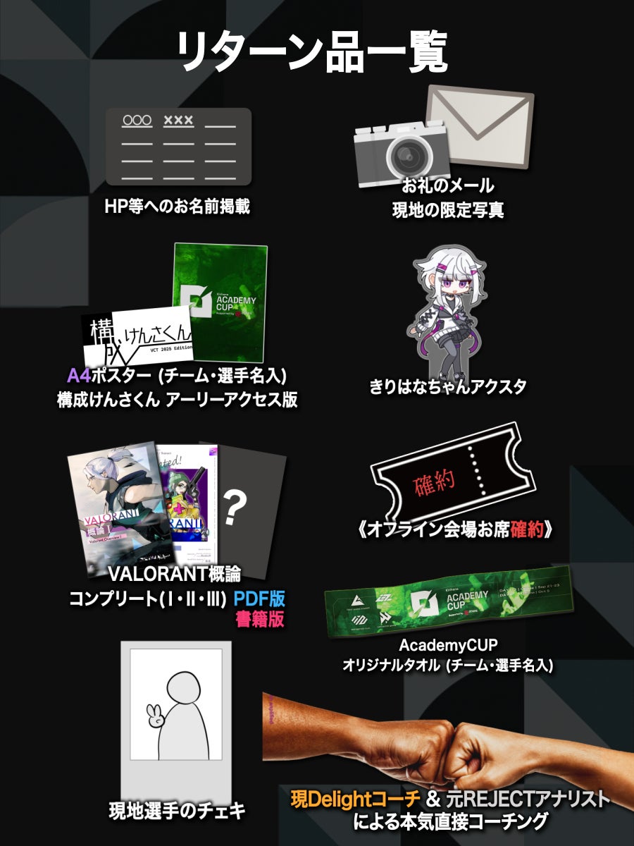 2025/09/28 00:19【進捗報告 第二弾】 こんばんは。きりはなプロジェクトの広報担当 吉田です。今回もクラファンの現状や大会の進捗について記載していきます。ーーーーーーーー・ご挨拶・クラファンの現状・進捗報告 >大会DAY1~3が行われました! >大会中間アンケートを行ってきました! >リターン品の発注を行いました!・次回告知 >ご家族からのメッセージーーーーーーーークラファンの現状 さて、現在の支援総額、支援者数は... ご支援をいただき本当にありがとうございます!!!! 現在は目標達成には及ばず、正直苦しい状況です…!オフライン決勝まであと1週間。最高の舞台を作るため、どうか皆様の応援をよろしくお願いします!進捗 ここからはトピックスごとに分けて進捗を報告していきます。・大会DAY1~3が行われました! 配信アーカイブはコチラになります ・DAY1 ・DAY2 ・DAY3 ・DAY4(配信予定) これにより、全6チームによるグループリーグ・セミファイナルが終了し、決勝に進むチームが決定しました!!!決勝は・Kirihana Academy・NORTHEPTION Youth Bの2チームが戦います!! 戦績は画像のようになっています。より詳しい情報はコチラ。 そして、決勝の舞台は秋葉原!! 10月5日の秋葉原 「eSports Studio AKIBA」でのオフライン開催となります。詳細はコチラ。 サラッと紹介しましたが、今大会の戦績がVLRに載るようになりました!!!!( VLR...プロ選手の戦績や公式大会の結果がずらりと並んだサイト。ダメ元で掲載をお願いしたら、参加チームがガチすぎてコミュニティ大会なのに許可が下りてしまった。) 他にも様々なコミュニティの方がきりはなacCUPを掲載してくださっています。本当にありがとうございました!!!大会中間アンケートを行ってきました! 大会はまだ続いていますが、一度アンケートという形で大会を振り返りたいと思い、様々な選手・コーチ・運営スタッフに回答していただきました。一部抜粋でお届けします。Q.大会開催前、 きりはなacCUPについてどのようなことを思っていましたか?コーチから情報を聞いたときはとても緊張しましたが、初めての配信試合に出れることが嬉しかったです!あったらいいなと思っていた大会が、しっかり形になって開催されていて尊敬していた久しぶりの大会で他のチームに知り合いも多かったのでとても楽しみだったQ.大会が行われてどのように考えが変化しましたか?クリップが切り抜かれたり、キャスターの方に褒められて自信がついたコミュニティ大会として最上のクオリティだったと思います。日本Eスポーツを将来牽引するかもしれない選手の一端を目の当たりにし、選手個人の技量やスキルセットもすべてが上手でした。 オペレーター卓は1スタッフとしてやりやすかったし、そこに自分の技術を使っていただけて良かったと思います。思ってたより作り込まれていて驚いた。 Xでの宣伝やチーム紹介、大会で出たスーパープレイの投稿 本大会でのルールやマップピックの仕様等、かなり本格的で楽しかったです。非常に素晴らしい大会であったと感じる一方で、さらに多くの注目を集めてほしいとも感じました。Q.アカデミー向け大会が今後も必要だと思いますか?必要だと思う。 プロとして活動する前に活躍することができれば早い段階からファンがつき、実際にプロデビューした段階で自分にファンがついている状態からプロ活動を始められ、選手にとって大きなメリットになると思うから。アカデミーチームは注目されにくいので今後とも出れる大会があればあるほど嬉しいです。自分の実力を証明できるチャンスなので日本シーンを発展させていくためにも、絶対に必要だと思います。絶対に必要! ただでさえtier1チームとtier2以下のチームじゃRiotからの待遇がだいぶ違うのに、アカデミーチームなんて中々Riot公式からチャンスとかサポートがもらえないと思うので、大会経験を積むチャンスやみんなに認知してもらえる機会としてもっとあっていいと思う。 もっと大会の機会がたくさんあれば、日本の競技レベルが上がっていくんじゃないかな~。Q.大会についてのご意見、ご感想などを自由にどうぞ負けてしまったので悔しいなという素直な感想です。ですが初めてのちゃんとした大会で運営の方々がスムーズに説明をしてくださりとても分かりやすかったです!ハーフタイムあると嬉しいですね。 ZETAとDFMがいるともっと盛り上がれると思う。 O-HYPE ACや今後設立されるであろうVARREL AC等も巻き込めると個人的にはうれしい。 アカデミー全体で盛り上げていきたい。他のコミュニティ大会と比べると、とても環境が整っているなと感じました。広報やオブザーバーも優秀な方が多く、これからより多くのチームやプレイヤーに注目される大会になりそうだなと感じました。 以上、様々なご意見を頂きました。回答していただき本当にありがとうございました。チームや役割が違う中でも大会に対する好意的な意見が多く、主催側としては喜ばしい限りです!開催してよかった~~~!!!!!リター