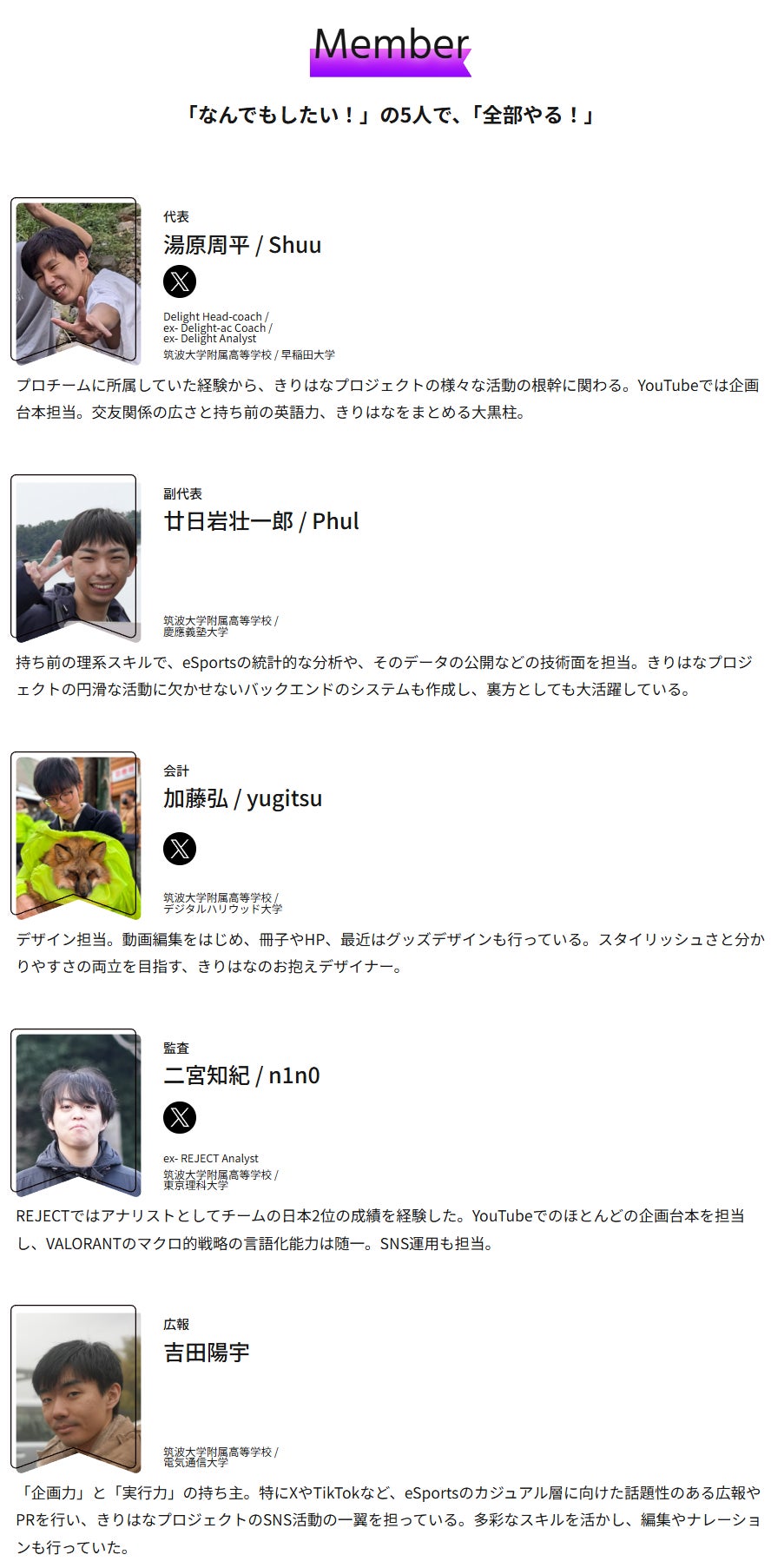私たちは「『みんなで』のゲームは面白い!」をモットーに、大学生の5人が集まり、YouTubeをはじめとした各種媒体で、世界的に人気なFPSゲームVALORANTについての情報発信を行って参りました。