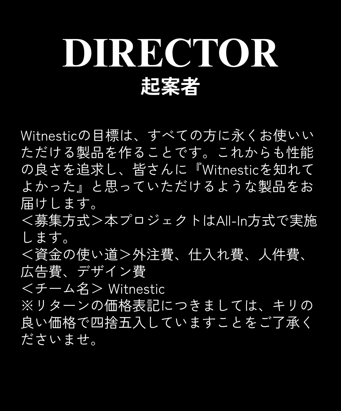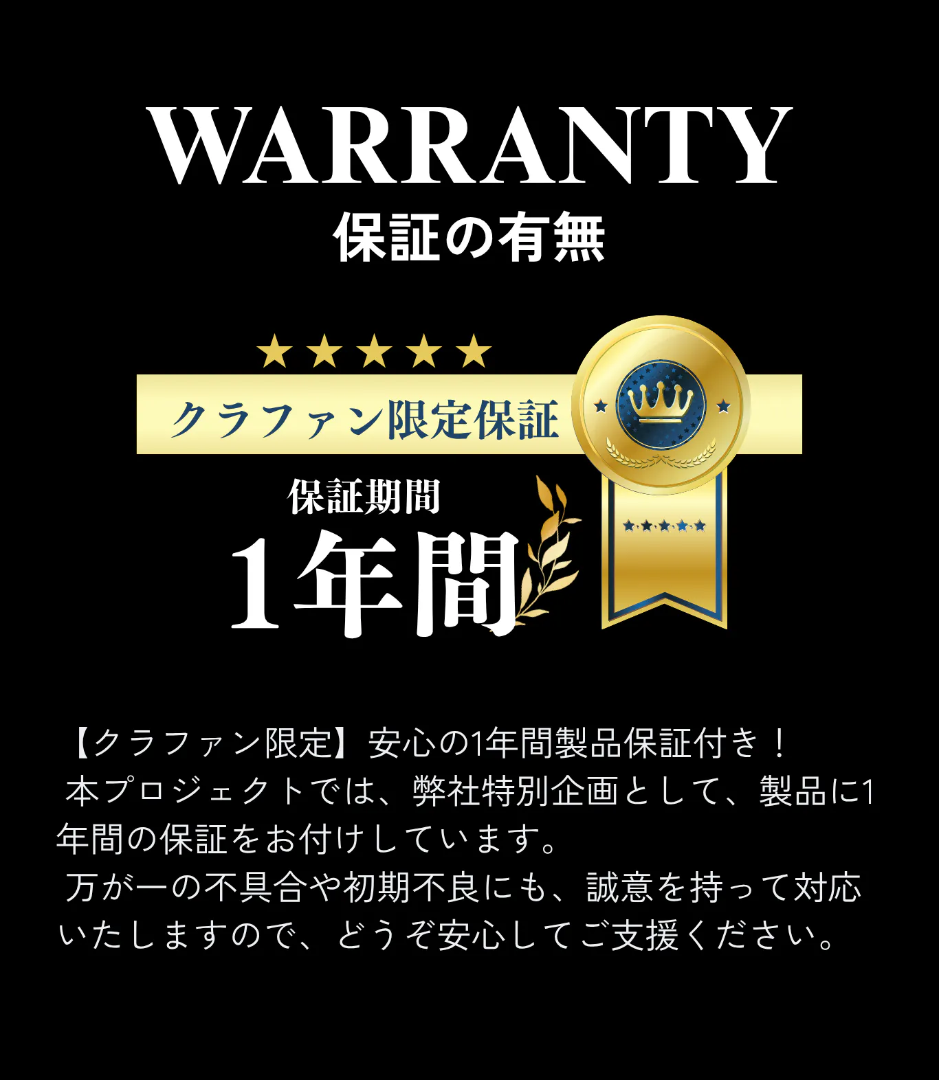 リターン価格:25,500円 (販売予定価格:36,450円) ※リターンはすべて税・送料込みの金額になります。 ※皆様の支援により量産効率が向上した場合、正規販売価格が販売予定価格より下がる可能性もございます。 類似商品が発生する可能性があります。ご了承頂いた上でご支援頂けます様お願い致します。 【配送時期】 商品到着は2025年12月を想定しております。 ※製造状況により出荷時期が遅れる場合がございます。 ※商品代を安くする為に工数削減をしており出荷連絡は致しません。活動報告をご覧ください。 ※配送時間の指定は承っておりません。万が一ご不在の場合は、不在票がポストに投函されますので、お手数ですが再配達の手続きをご自身でお願い申し上げます。 ※保管期限超過などにより荷物が弊社へ返送された場合、再送手数料および送料(1,800円)をご負担いただきます。