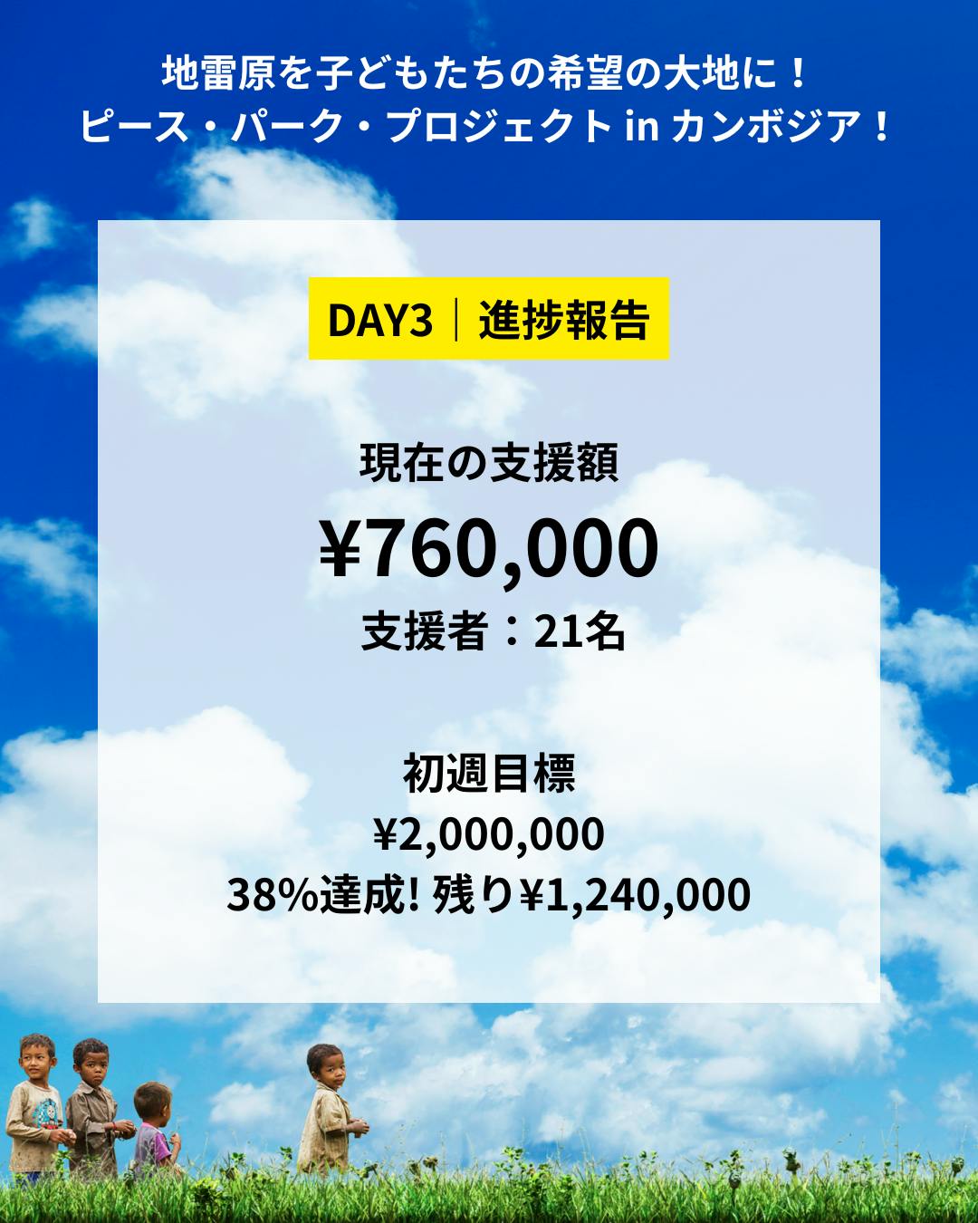 DAY3 進捗報告です!現在、支援総額 ¥760,000/支援者 21名となりました。初週目標200万円まで 38%達成(残り ¥1,240,000)。本当にありがとうございます!