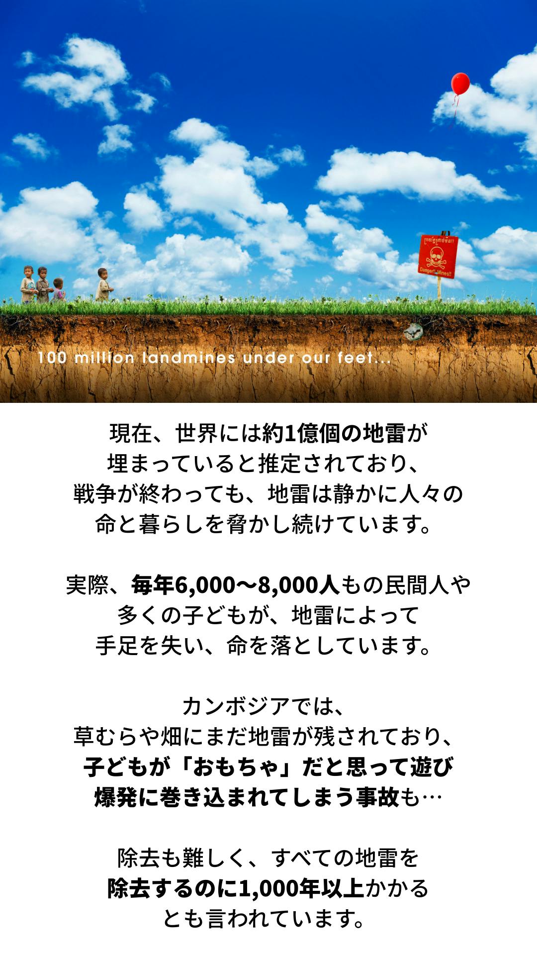 世界の状況:地雷は約1億個が残存し、毎年6,000〜8,000人(子どもを含む)が被害にあっています。戦争終結後も生活と発展を妨げ続けます。