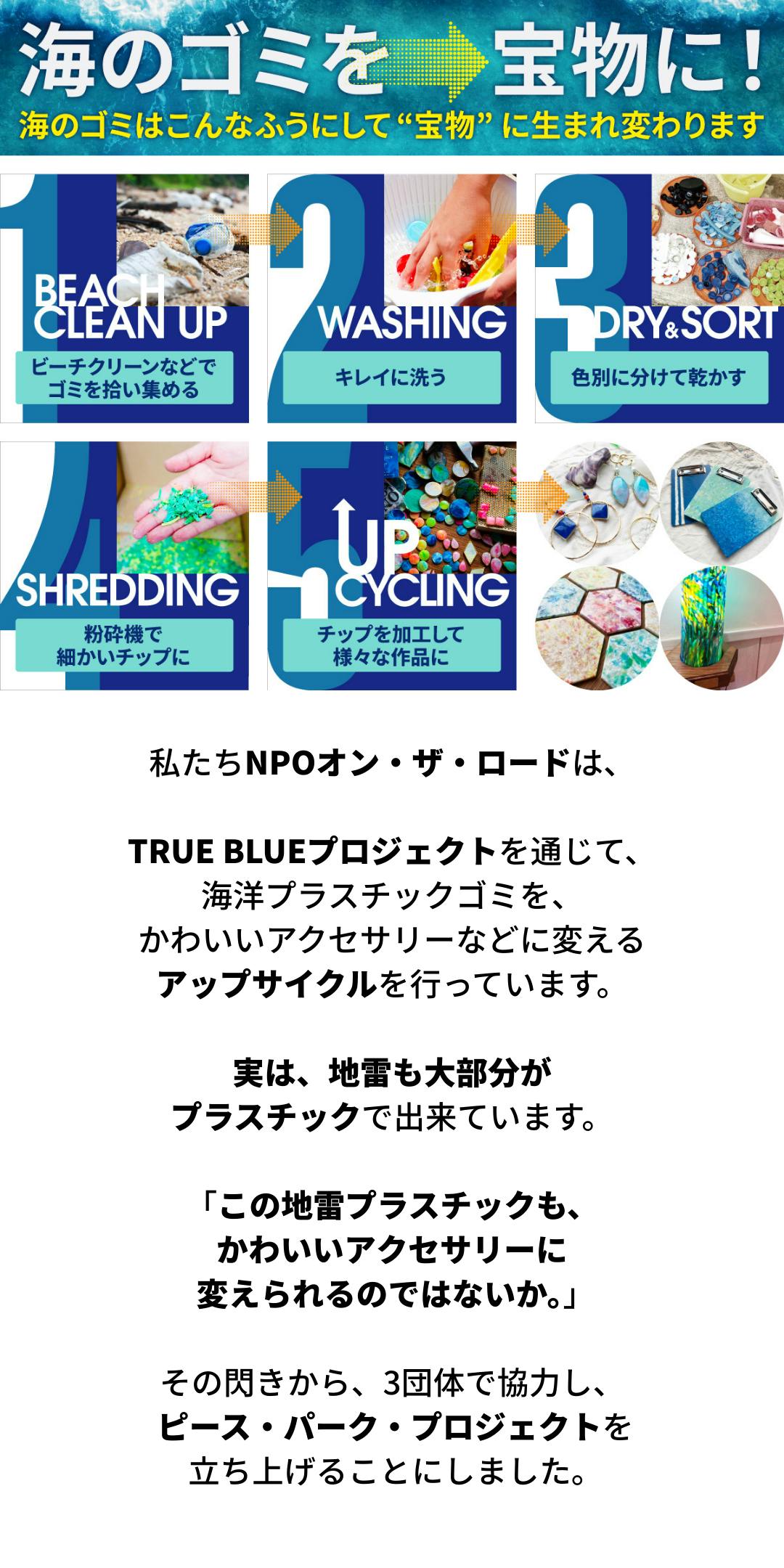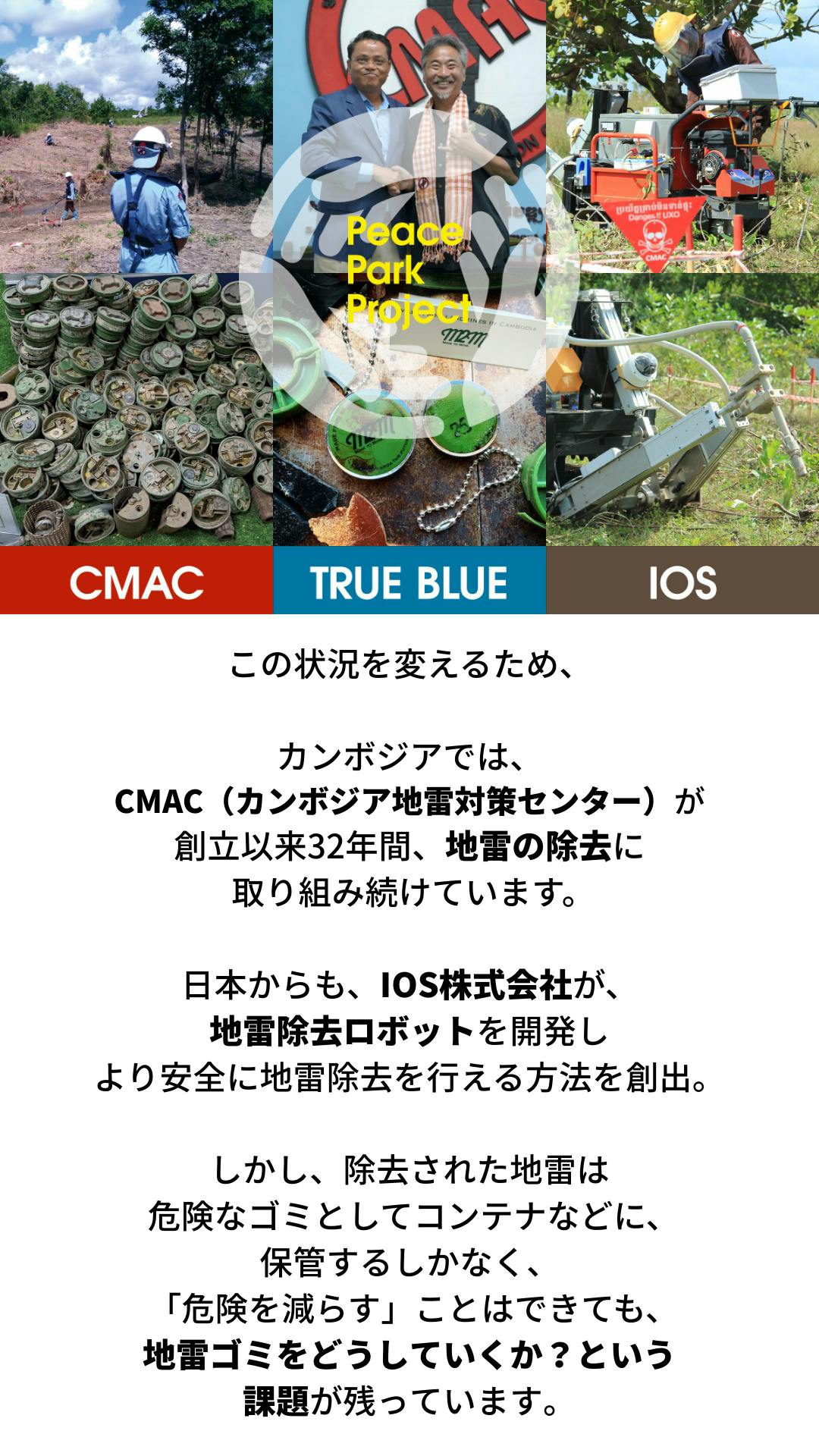 私たちの役割:NPO On the Road/TRUE BLUEは、CMAC・IOS株式会社と連携し、安全が確認された土地を使える場へ転換する「Peace Park Project」を進めます。