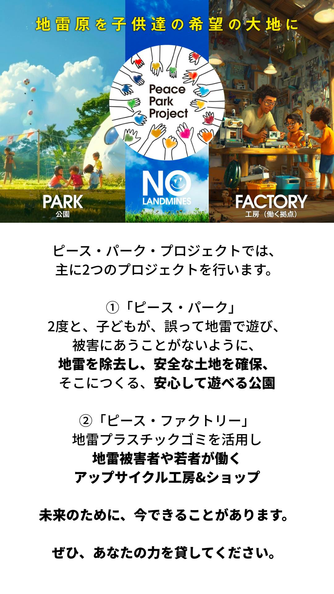 Peace Park(ピース・パーク)は、地雷が確実に取り除かれた安全な土地に、子どもたちが安心して遊べる小さな公園をつくる取り組みです。