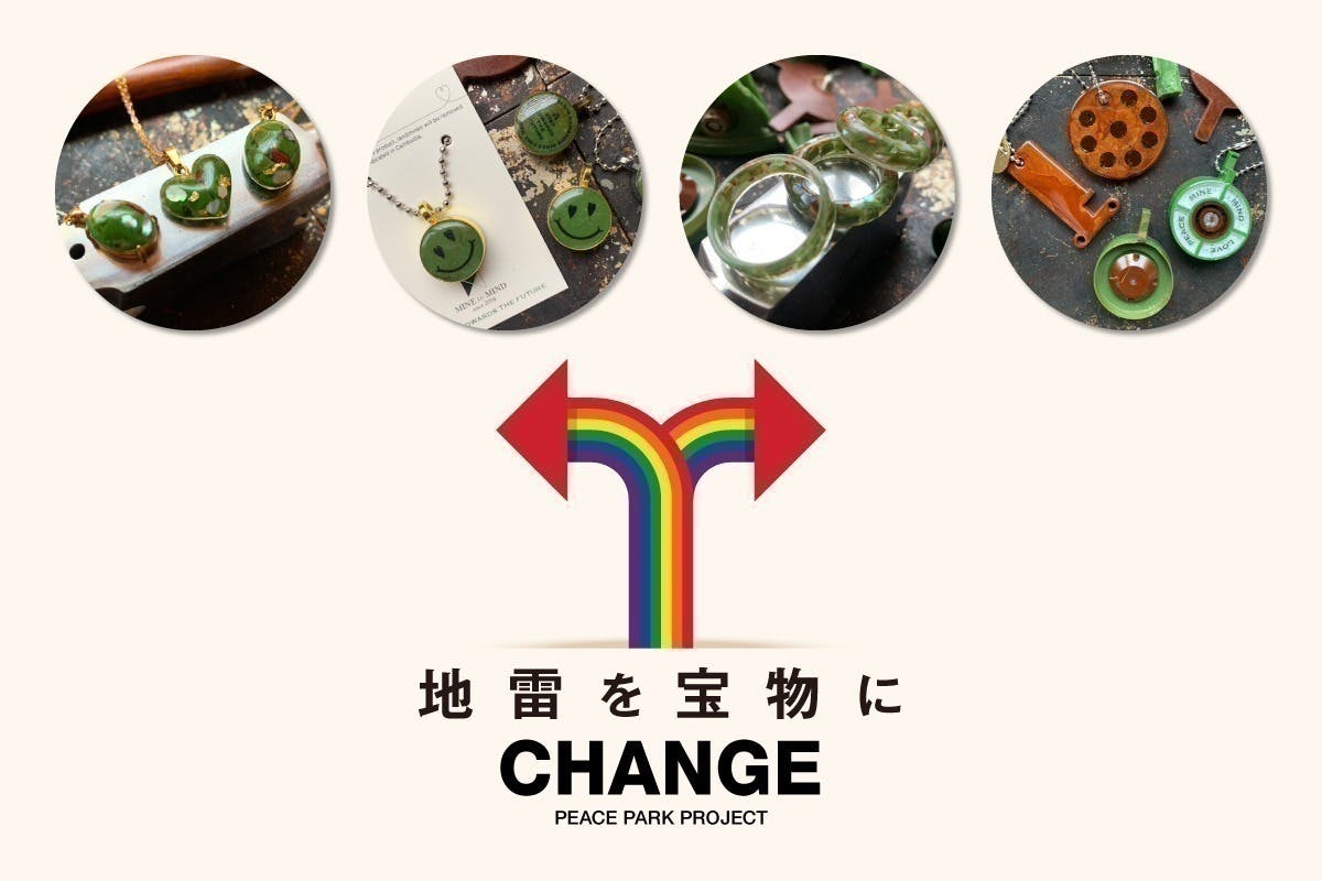 地雷・不発弾が埋められていた場所から回収されたプラスチックを使い、アーティストが一点ずつ仕上げたアクセサリーをお届けするコースです。世界にひとつだけの「地雷プラ」作品とともに、地雷除去とPeace Park / Peace Factory の実現を力強く応援していただけます。