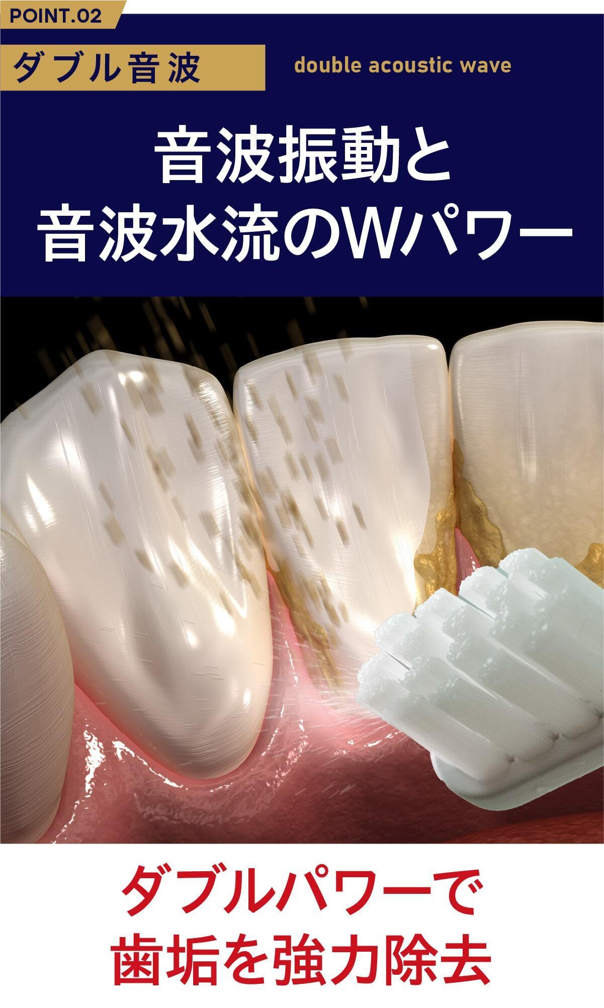1分間に22,000回の振動が発生することで、高速なストローク運動(前後振動)が起こり、歯の表面や歯間に付着した歯垢を効果的に除去します。手磨き(約300~600回/分)と比較すると、圧倒的に細かく、強力な磨き効果を得られます。