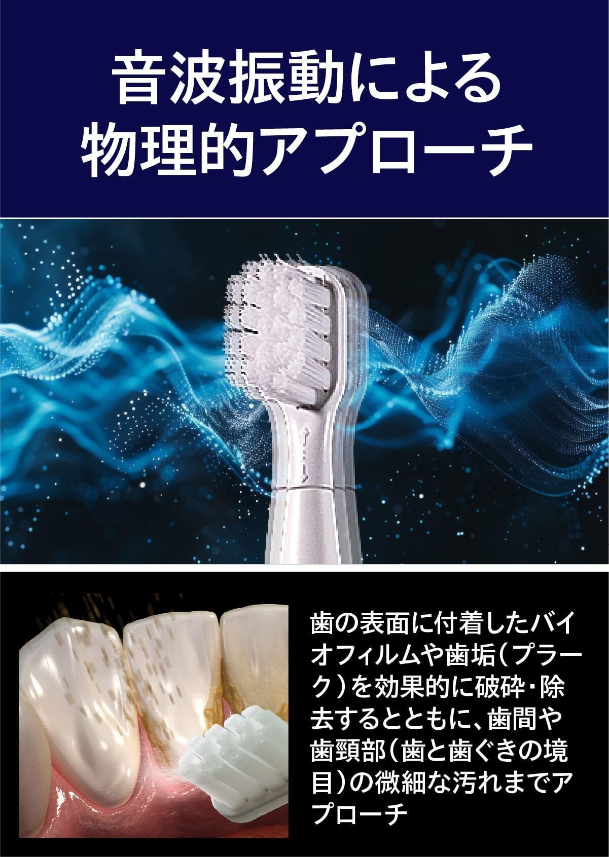 ミニマルソニックの振動は、音波(20,000Hz以上)に近い周波数を持ち、音波水流(Fluid Dynamics Effect)を発生させます。この水流によって、ブラシの毛先が直接触れていない場所(歯間・歯周ポケット)の汚れを浮かせて除去する効果が期待できます。