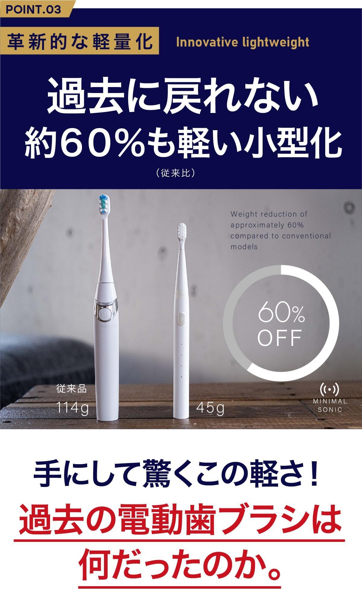従来比約60%軽量化に成功、かつウルトラソニックパワー搭載、そしてリマインダー機能も。新しいガジェットを探している方にも、電動歯ブラシ未体験の方にも、2台目を探している方にも最適です。