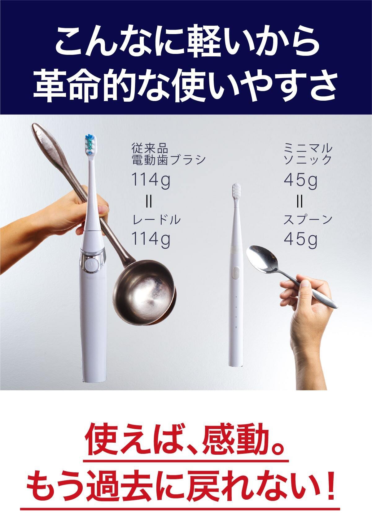 レードル(おたま)の重量は114g、これは従来の電動歯ブラシと同じです。スプーンの重量は45g、これがミニマルソニックと同じです。こんなに軽いから革命的な使いやすさを実現しました。