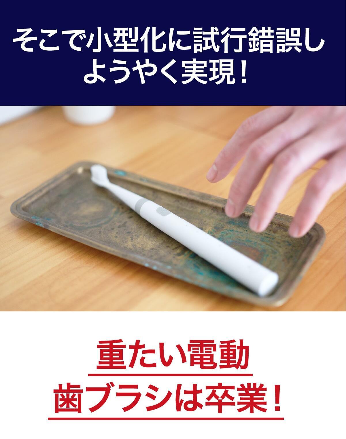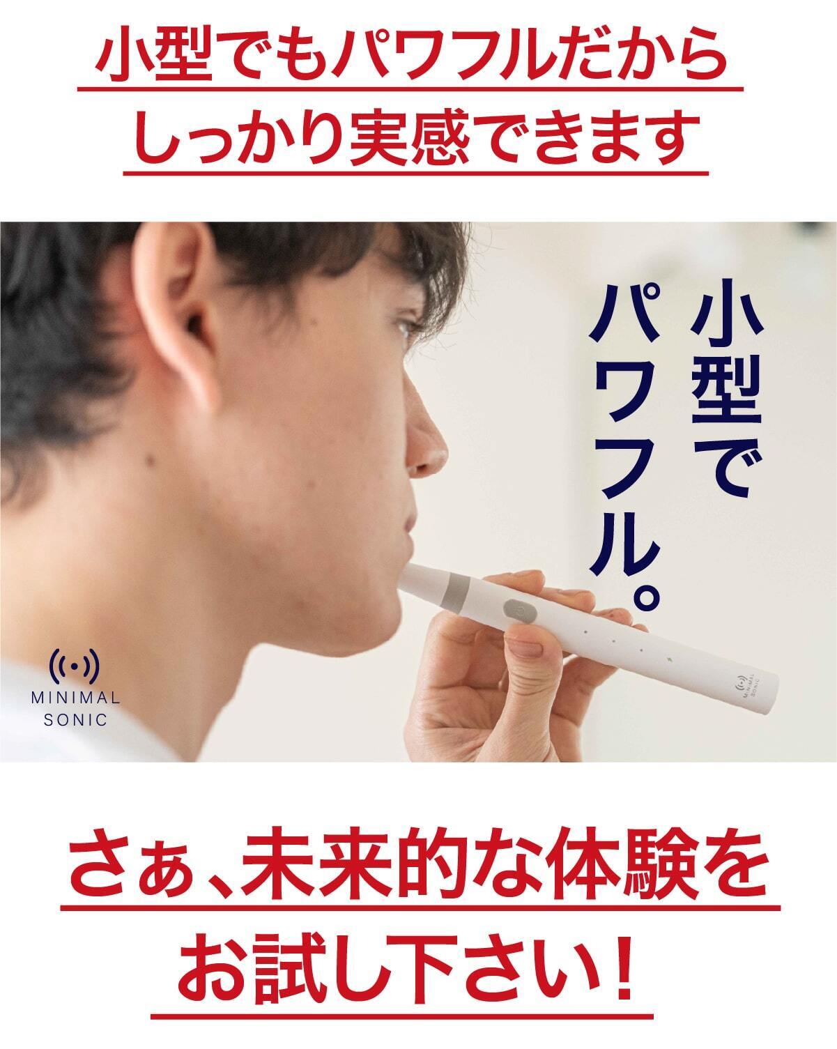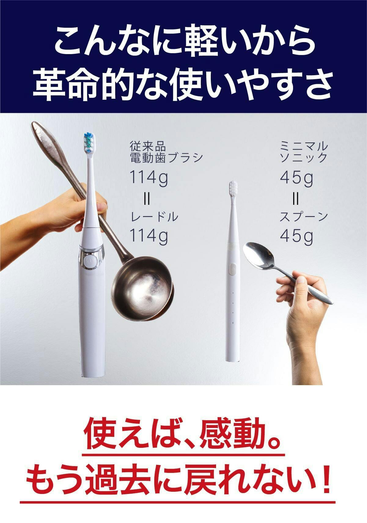 今までの電動歯ブラシを大きいと感じたことはありませんか?普通の歯ブラシから電動歯ブラシに変えた時にそれを大きく感じると思います。電動歯ブラシは構造上、大型化してしまうのですが、常識に囚われずまったく新しい電動歯ブラシを設計したのがこのミニマルソニックです。新発想の構造で小型でパワフル。未来の体験をはじめましょう。