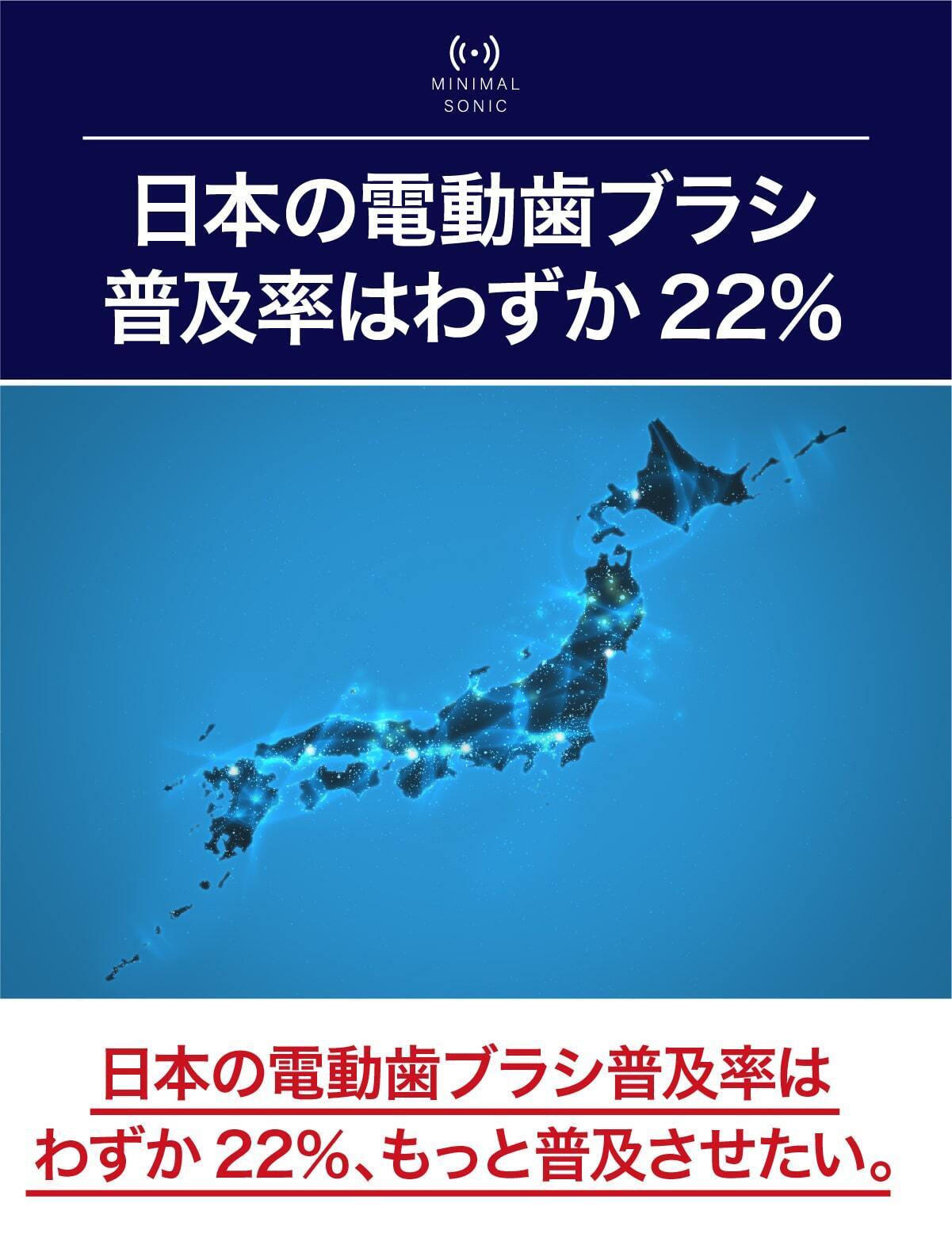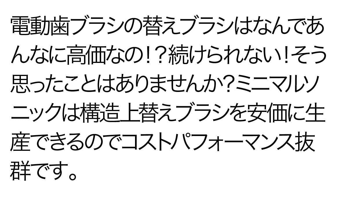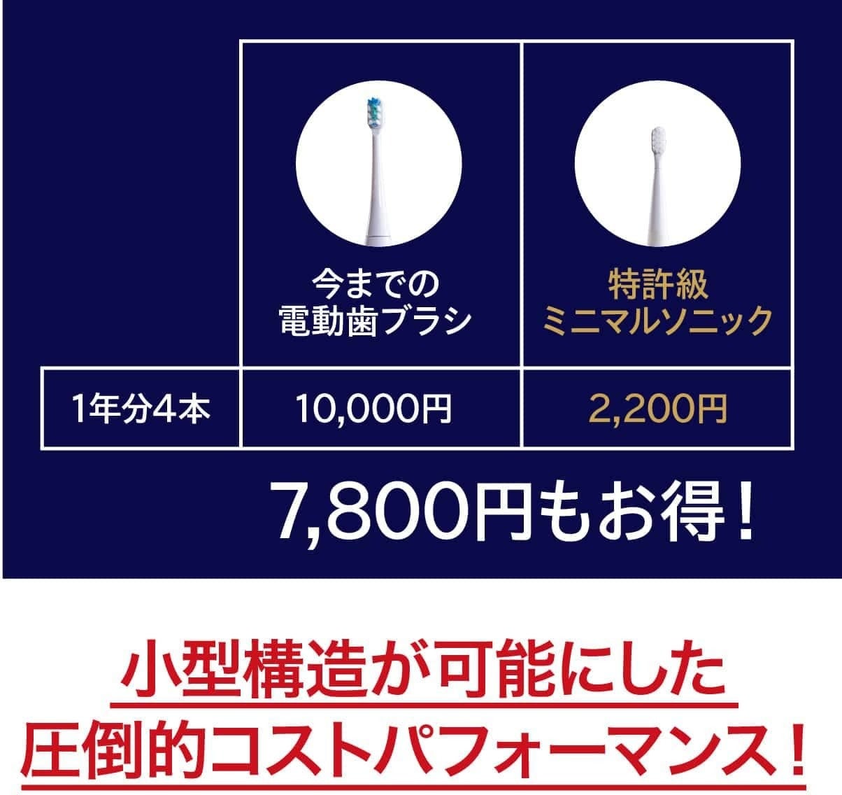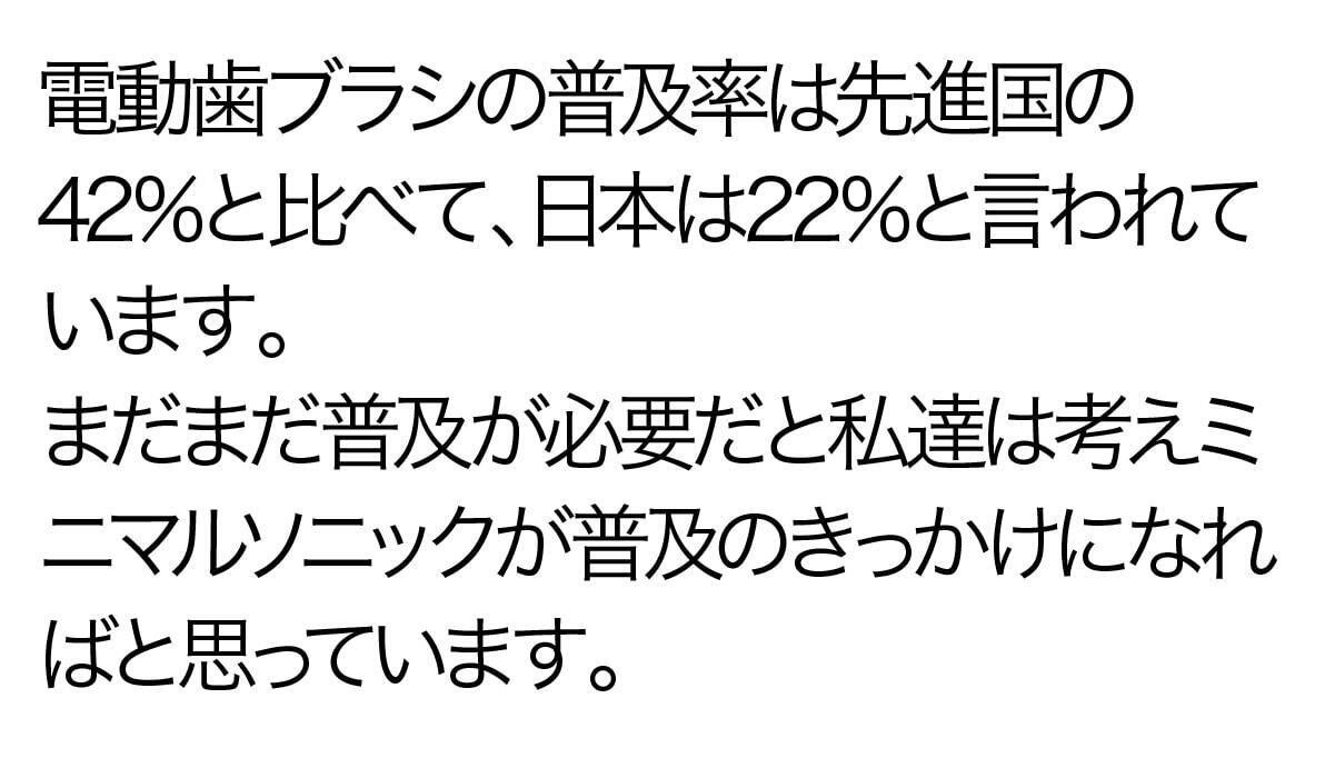 今までの電動歯ブラシを大きいと感じたことはありませんか?普通の歯ブラシから電動歯ブラシに変えた時にそれを大きく感じると思います。電動歯ブラシは構造上、大型化してしまうのですが、常識に囚われずまったく新しい電動歯ブラシを設計したのがこのミニマルソニックです。新発想の構造で小型でパワフル。未来の体験をはじめましょう。