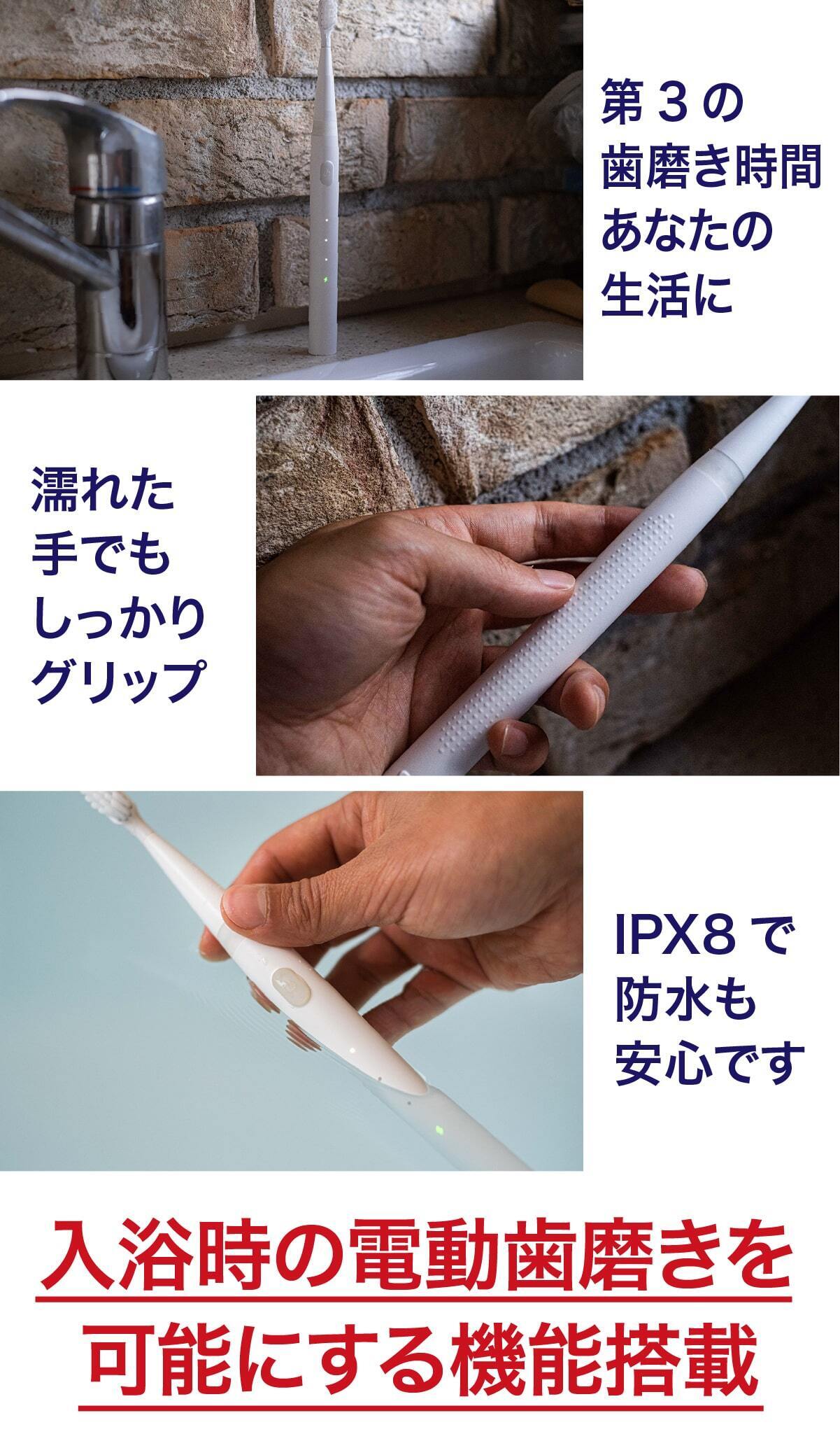入浴中に歯を磨くには、防水機能の他に水滴などで磨く手が滑らないようにする必要があります。ミニマルソニックは「粒子グリップ」を搭載し、入浴中の歯磨きに最適です。